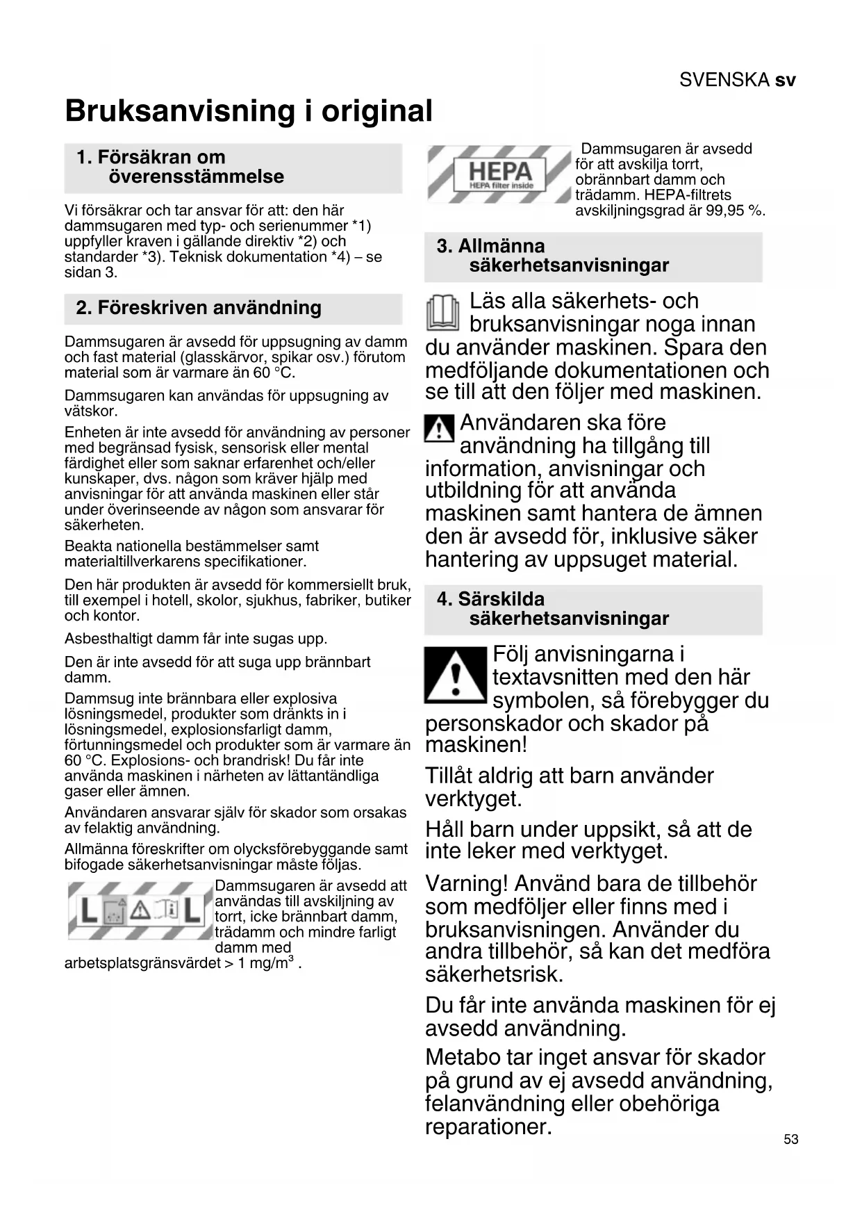 Bruksanvisning i original Vi försäkrar och tar ansvar för att: den här dammsugaren med typ- och serienummer *1) uppfyller kraven i gällande direktiv *2) och standarder *3). Teknisk dokumentation *4) – se sidan 3. Dammsugaren är avsedd för uppsugning av damm och fast material (glasskärvor, spikar osv.) förutom material som är varmare än 60 °C. Dammsugaren kan användas för uppsugning av vätskor. Enheten är inte avsedd för användning av personer med begränsad fysisk, sensorisk eller mental färdighet eller som saknar erfarenhet och/eller kunskaper, dvs. någon som kräver hjälp med anvisningar för att använda maskinen eller står under överinseende av någon som ansvarar för säkerheten. Beakta nationella bestämmelser samt materialtillverkarens specifikationer. Den här produkten är avsedd för kommersiellt bruk, till exempel i hotell, skolor, sjukhus, fabriker, butiker och kontor. Asbesthaltigt damm får inte sugas upp. Den är inte avsedd för att suga upp brännbart damm. Dammsug inte brännbara eller explosiva lösningsmedel, produkter som dränkts in i lösningsmedel, explosionsfarligt damm, förtunningsmedel och produkter som är varmare än 60 °C. Explosions- och brandrisk! Du får inte använda maskinen i närheten av lättantändliga gaser eller ämnen. Användaren ansvarar själv för skador som orsakas av felaktig användning. Allmänna föreskrifter om olycksförebyggande samt bifogade säkerhetsanvisningar måste följas. Dammsugaren är avsedd att användas till avskiljning av torrt, icke brännbart damm, trädamm och mindre farligt damm med arbetsplatsgränsvärdet > 1 mg/m³ . Dammsugaren är avsedd för att avskilja torrt, obrännbart damm och trädamm. HEPA-filtrets avskiljningsgrad är 99,95 %. Läs alla säkerhets- och bruksanvisningar noga innan du använder maskinen. Spara den medföljande dokumentationen och se till att den följer med maskinen. Användaren ska före användning ha tillgång till information, anvisningar och utbildning för att använda maskinen samt hantera de ämnen den är avsedd för, inklusive säker hantering av uppsuget material. Följ anvisningarna i textavsnitten med den här symbolen, så förebygger du personskador och skador på maskinen! Tillåt aldrig att barn använder verktyget. Håll barn under uppsikt, så att de inte leker med verktyget. Varning! Använd bara de tillbehör som medföljer eller finns med i bruksanvisningen. Använder du andra tillbehör, så kan det medföra säkerhetsrisk. Du får inte använda maskinen för ej avsedd användning. Metabo tar inget ansvar för skador på grund av ej avsedd användning, felanvändning eller obehöriga reparationer.