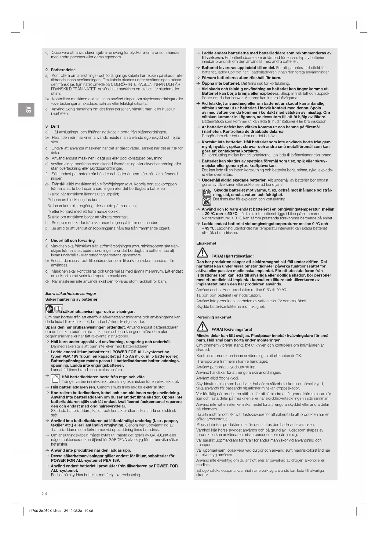 Översättning av originalanvisningarna. Den här produkten kan användas av barn från 8 år och äldre och personer med fysisk, sensorisk eller mental funktionsnedsättning eller bristande erfarenhet och kunskap, om de hålls under uppsikt eller har fått instruktioner om säker användning av produkten och förstår faror- na som kan uppstå från användningen. Barn får inte leka med produkten. Rengöring och använ- darunderhåll får inte genomföras av barn utan uppsikt. Vi rekommenderar att produkten används av ungdomar över 16 år. Avsedd användning: GARDENA Trimmer är avsedd att trimma och klippa gräsmattor och gräsytor i villa- och hobby trädgårdar. Produkten är inte konstruerad för långtidsanvändning. FARA! Kroppsskada! v Använd inte produkten för att klippa häckar, för att sönderdela material eller för att kompostera. 14700-20.960.01.indd 23 19.08.20 10:08SV