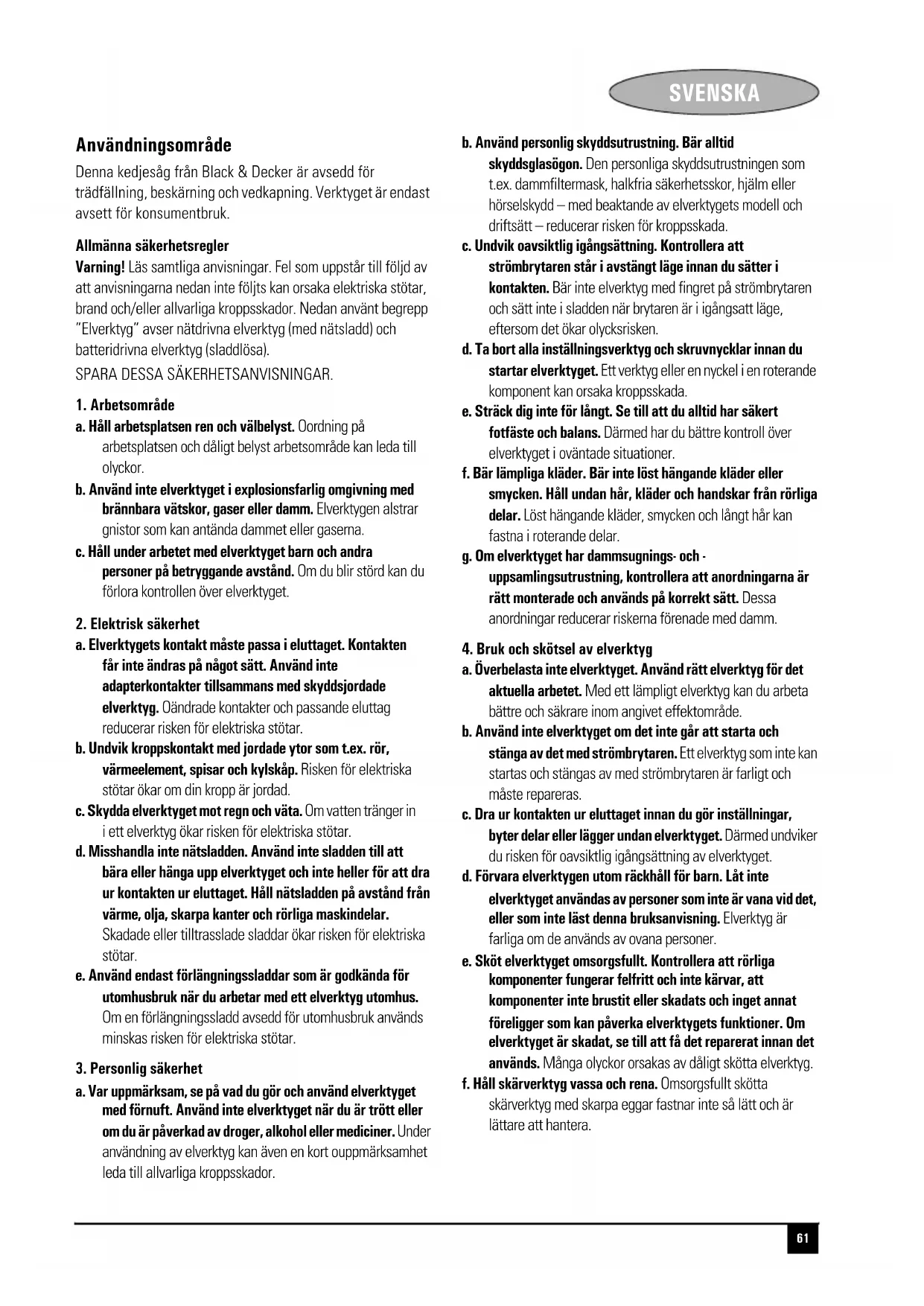 Peso (kg) 5.55 5.65 5.8 5.6 5.7 5.85 Classe de segurança II II II II II II61 SVENSKA SWEDISH Användningsområde Denna kedjesåg från Black & Decker är avsedd för trädfällning, beskärning och vedkapning. Verktyget är endast avsett för konsumentbruk. Allmänna säkerhetsregler Varning! Läs samtliga anvisningar. Fel som uppstår till följd av att anvisningarna nedan inte följts kan orsaka elektriska stötar, brand och/eller allvarliga kroppsskador. Nedan använt begrepp ”Elverktyg” avser nätdrivna elverktyg (med nätsladd) och batteridrivna elverktyg (sladdlösa). SPARA DESSA SÄKERHETSANVISNINGAR.
