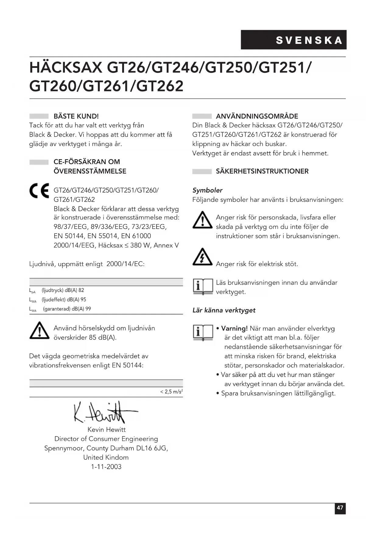 ÖVERENSSTÄMMELSE GT26/GT246/GT250/GT251/GT260/ GT261/GT262 Black & Decker förklarar att dessa verktyg är konstruerade i överensstämmelse med: 98/37/EEG, 89/336/EEG, 73/23/EEG, EN 50144, EN 55014, EN 61000 2000/14/EEG, Häcksax ≤ 380 W, Annex V Ljudnivå, uppmätt enligt 2000/14/EC: