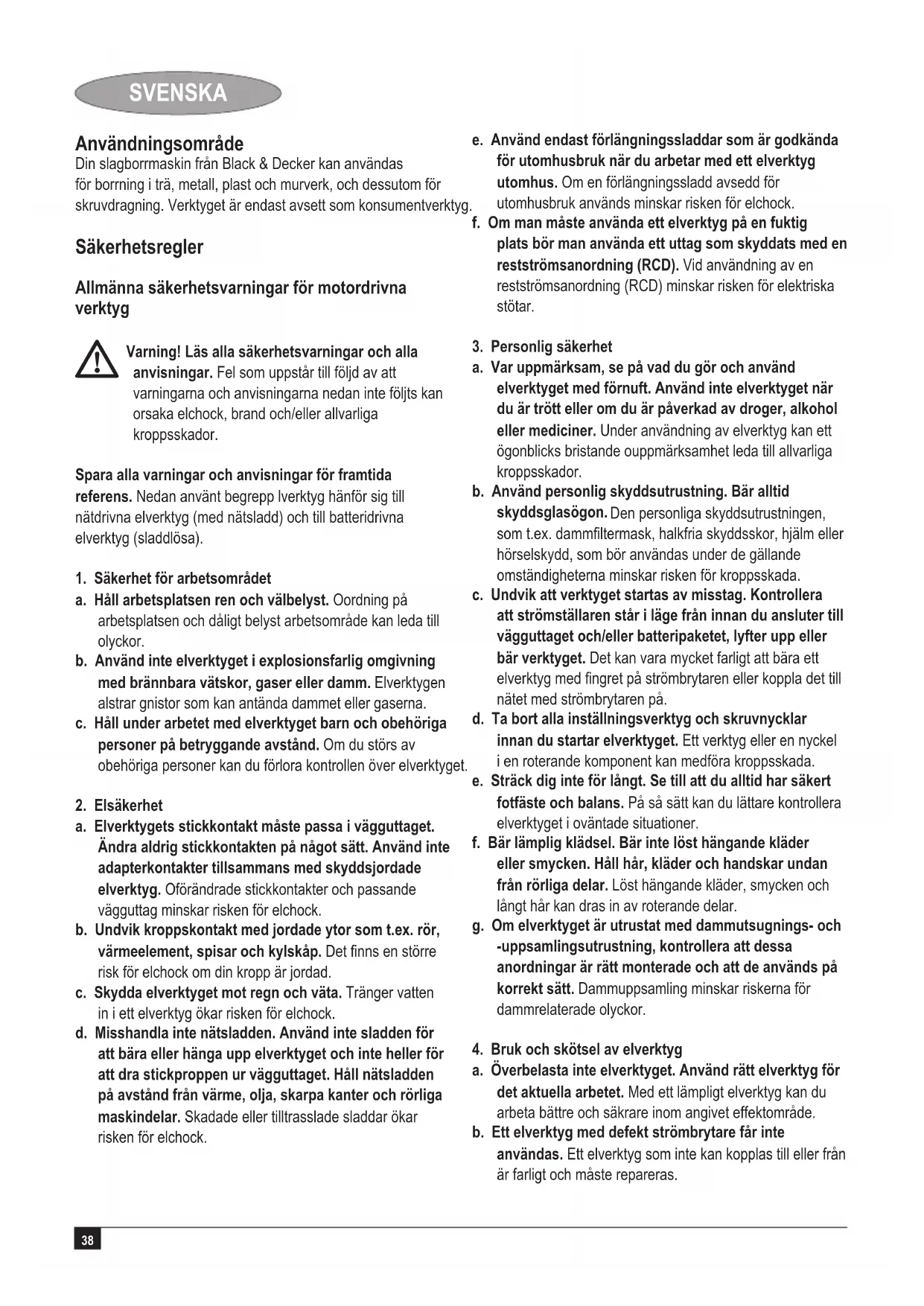 Kevin Hewitt Director of Consumer Engineering Spennymoor, County Durham DL16 6JG, Storbrittannien 1-8-2007 Reservdelar / reparationer Reservdelar finns att köpa hos auktoriserade Black & Decker verkstäder, som även ger kostnadsförslag och reparerar våra produkter. Förteckning över våra auktoriserade verkstäder finns på Internet, vår hemsida www.blackanddecker.se samt www.2helpU.com42 SVENSKA Garanti Black & Decker garanterar att produkten är fri från material- och/eller fabrikationsfel vid leverans till kund. Garantin är i tillägg till konsumentens lagliga rättigheter och påverkar inte dessa. Garantin gäller inom medlemsstaterna i Europeiska Unionen och i det Europeiska Frihandelsområdet. Om en Black & Decker produkt går sönder på grund av material- och/eller fabrikationsfel eller brister i överensstämmelse med specifikationen, inom 24 månader från köpet, åtar sig Black & Decker att reparera eller byta ut produkten med minsta besvär för kunden. Garantin gäller inte för fel som beror på: normalt slitage felaktig användning eller skötsel att produkten skadats av främmande föremål, ämnen eller genom olyckshändelse Garantin gäller inte om reparation har utförts av någon annan än en auktoriserad Black & Decker verkstad. För att utnyttja garantin skall produkten och inköpskvittot lämnas till återförsäljaren eller till en auktoriserad verkstad senast 2 månader efter det att felet har upptäckts. För information om närmaste auktoriserad verkstad; kontakta det lokala Black & Decker kontoret på den adress som är angiven i bruksanvisningen. En lista på alla auktoriserade verkstäder samt servicevillkor finns även tillgängligt på Internet, adress: www.2helpU.com Besök vår webbplats www.blackanddecker.se för att registrera din nya Black & Decker-produkt samt för att erhålla information om nya produkter och specialerbjudanden. Vidare information om märket Black & Decker och vårt produktsortiment kan återfinnas på www.blackanddecker.se43 NORSK Bruksområder Din Black & Decker slagbormaskin er beregnet på boring i tre, metall, plast og murverk, samt å brukes som skrutrekker. Verktøyet er tiltenkt kun som konsumentverktøy. Sikkerhetsinstruksjoner Generelle sikkerhetsadvarsler for elektroverktøy