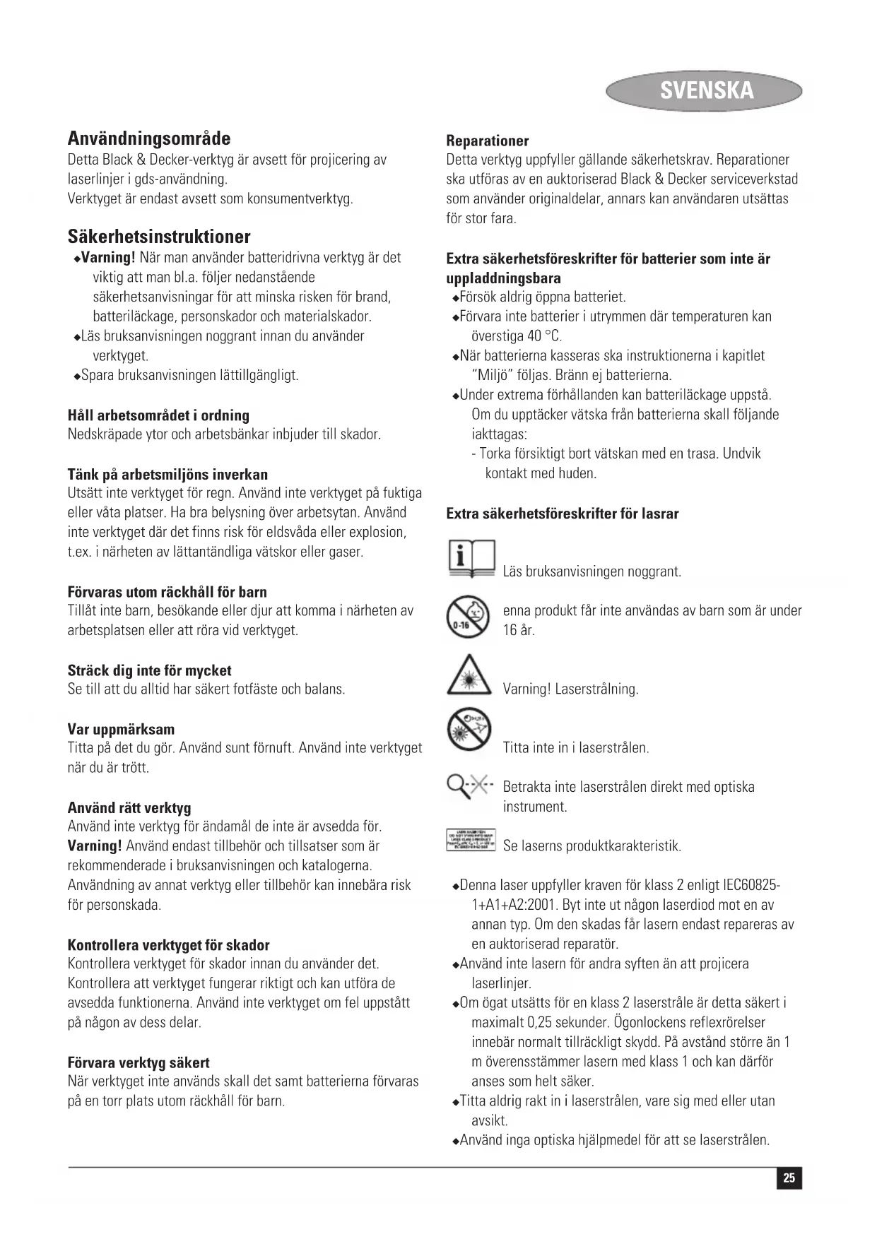 Montering Varning! Kontrollera att verktyget är avstängt. Montering av batterierna (fig. A) ◆ Ta bort batterilocket (4) från verktyget. ◆ Sätt i batterierna i verktyget på det sätt som anges. ◆ Sätt tillbaka locket så att det knäpper fast. Väggmontering (fig. B & C) Verktyget kan monteras på väggar med hjälp av ett av väggfästena (5 eller 6). Väggstiftet (5) används för att hänga verktyget på gipsplattor. Nyckelhålsfästet (6) används för att hänga upp verktyget på andra slags väggar med hjälp av en skruv eller spik. Varning! Förvara väggfästena på en säker plats när de inte används. Väggstift ◆ Fäll ut det platta stiftet (7). ◆ Håll väggstiftet framför lämplig plats och tryck stiftet rakt in i väggen. ◆ Sätt fast verktyget genom att låta magneten (8) fastna på väggstiftet (5). Varning! Väggstiftet är vasst och bör behandlas försiktigt. Nyckelhålsfäste ◆ Driv in en skruv eller spik i väggen. ◆ Häng väggfästet (6) på stödet. ◆ Installera verktyget genom att låta magneten (8) fastna på nyckelhålsfästet (6). Användning (fig. D) ◆ Placera verktyget plant mot väggen som bilden visar. ◆ Tryck strömbrytaren (1) uppåt för att sätta på verktyget. ◆ Flytta verktyget efter behov för att laserlinjen ska vara rätt. ◆ Häng verktyget på väggen med hjälp av lämpligt väggfäste. Inställning av laserlinjen (fig. E) ◆ Justera verktyget tills vattenpasset (9) är vågrätt för att projicera en vertikal linje. ◆ Justera verktyget tills vattenpasset (10) är vågrätt för att projicera en horisontell linje. Användning av skalan Skalan (11) på väggfästet kan användas för justering av vinkeln. ◆ Placera 0°-positionen på skalan i riktning med markören på verktyget genom att vrida väggstiftet. ◆ Justera skalan för att kontrollera en vinkel. Miljöskydd Särskild insamling. Denna produkt får inte kastas bland vanliga hushållssopor. Om du någon gång i framtiden behöver ersätta din Black & Decker-produkt med en ny, eller inte längre behöver den, ska du inte kasta den i hushållssoporna. Denna produkt skall lämnas till särskild insamling. Efter insamling av använda produkter och förpackningsmaterial kan materialen återvinnas och användas på nytt. Användning av återvunna material skonar miljön och minskar förbrukningen av råvaror. Enligt lokal lagstiftning kan det förekomma särskilda insamlingar av uttjänt elutrustning från hushåll, antingen vid kommunala miljöstationer eller hos detaljhandlaren när du köper en ny produkt. Black & Decker erbjuder en insamlings- och återvinningstjänst för Black & Decker-produkter när de en gång har tjänat ut. För att använda den här tjänsten lämnar du in produkten till en auktoriserad Black & Decker –reparatör/representant som tar hand om den för vår räkning. Närmaste auktoriserade Black & Decker-representant finner du genom det lokala Black & Decker-kontoret på adressen i den här manualen. Annars kan du söka på Internet, på listan över auktoriserade Black & Decker-representanter och alla uppgifter om vår kundservice och andra kontakter. www.2helpU.com Batterier Skydda miljön genom att lämna uttjänta batterier till avsedd uppsamlingsplats. ◆ Tag bort batterierna enligt beskrivningen ovan. ◆ Placera batterierna i en lämplig förpackning så att kontakterna inte kan kortslutas. ◆ Lämna batterierna till den lokala återvinningsstationen.27 SVENSKA Tekniska data BDL120 Spänning V 3 Batteristorlek 2 x LR6 (AA) Laserklass 2 Driftstemperatur °C 0 - 40 Vikt (utan batteri) kg 0,2 CE-försäkran om överensstämmelse Black & Decker förklarar att dessa verktyg är konstruerade i överensstämmelse med: EN 61010-1, IEC 60825-1, EN 61000-6-3, EN 61000-6-1 Kevin Hewitt Director of Consumer Engineering Spennymoor, County Durham DL16 6JG, United Kingdom 1-10-2005 Reservdelar / reparationer Reservdelar finns att köpa hos auktoriserade Black & Decker verkstäder, som även ger kostnadsförslag och reparerar våra produkter. Förteckning över våra auktoriserade verkstäder finns på Internet, vår hemsida www.blackanddecker.se samt www.2helpU.com Garanti Black & Decker garanterar att produkten är fri från material- och/eller fabrikationsfel vid leverans till kund. Garantin är i tillägg till konsumentens lagliga rättigheter och påverkar inte dessa. Garantin gäller inom medlemsstaterna i Europeiska Unionen och i det Europeiska Frihandelsområdet. Om en Black & Decker produkt går sönder på grund av material- och/eller fabrikationsfel eller brister i överensstämmelse med specifikationen, inom 24 månader från köpet, åtar sig Black & Decker att reparera eller byta ut produkten med minsta besvär för kunden. Garantin gäller inte för fel som beror på: ◆ normalt slitage ◆ felaktig användning eller skötsel ◆ att produkten skadats av främmande föremål, ämnen eller genom olyckshändelse Garantin gäller inte om reparation har utförts av någon annan än en auktoriserad Black & Decker verkstad. För att utnyttja garantin skall produkten och inköpskvittot lämnas till återförsäljaren eller till en auktoriserad verkstad senast 2 månader efter det att felet har upptäckts. För information om närmaste auktoriserad verkstad; kontakta det lokala Black & Decker kontoret på den adress som är angiven i bruksanvisningen. En lista på alla auktoriserade verkstäder samt servicevillkor finns även tillgängligt på Internet, adress: www.2helpU.com Besök vår webbplats www.blackanddecker.se för att registrera din nya Black & Decker-produkt samt för att erhålla information om nya produkter och specialerbjudanden. Vidare information om märket Black & Decker och vårt produktsortiment kan återfinnas på www.blackanddecker.se28 NORSK Tiltenkt bruk Dette verktøyet fra Black & Decker er konstruert for å projisere laserstråler for håndverksoppgaver av gjør-det-selv-typen. Verktøyet er tiltenk