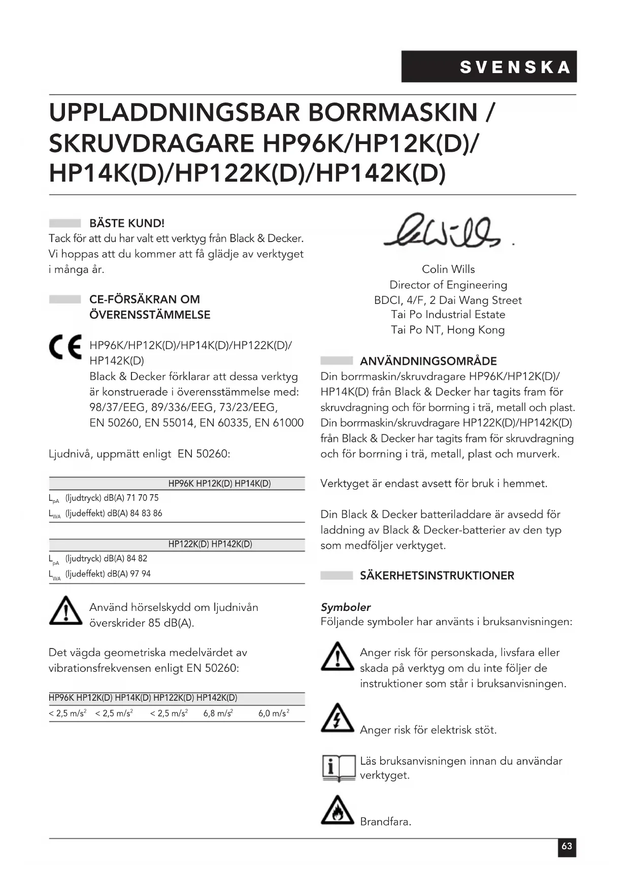 ÖVERENSSTÄMMELSE HP96K/HP12K(D)/HP14K(D)/HP122K(D)/ HP142K(D) Black & Decker förklarar att dessa verktyg är konstruerade i överensstämmelse med: 98/37/EEG, 89/336/EEG, 73/23/EEG, EN 50260, EN 55014, EN 60335, EN 61000 Ljudnivå, uppmätt enligt EN 50260: HP96K HP12K(D) HP14K(D)