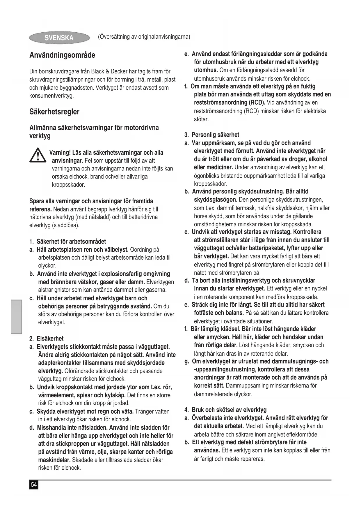 Kevin Hewitt Vice-President Global Engineering Black & Decker Europe, 210 Bath Road, Slough, Berkshire, SL1 3YD Storbritannien 10/03/201060 (Översättning av originalanvisningarna) SVENSKA Reservdelar / reparationer Reservdelar nns att köpa hos auktoriserade Black & Decker verkstäder, som även ger kostnadsförslag och reparerar våra produkter. Förteckning över våra auktoriserade verkstäder nns på Internet, vår hemsida www.blackanddecker.se samt www.2helpU.com Garanti Black & Decker garanterar att produkten är fri från material- och/eller fabrikationsfel vid leverans till kund. Garantin är i tillägg till konsumentens lagliga rättigheter och påverkar inte dessa. Garantin gäller inom medlemsstaterna i Europeiska Unionen och i det Europeiska Frihandelsområdet. Om en Black & Decker produkt går sönder på grund av material- och/eller fabrikationsfel eller brister i överensstämmelse med specikationen, inom 24 månader från köpet, åtar sig Black & Decker att reparera eller byta ut produkten med minsta besvär för kunden. Garantin gäller inte för fel som beror på: u normalt slitage u felaktig användning eller skötsel u att produkten skadats av främmande föremål, ämnen eller genom olyckshändelse Garantin gäller inte om reparation har utförts av någon annan än en auktoriserad Black & Decker verkstad. För att utnyttja garantin skall produkten och inköpskvittot lämnas till återförsäljaren eller till en auktoriserad verkstad senast 2 månader efter det att felet har upptäckts. För information om närmaste auktoriserad verkstad; kontakta det lokala Black & Decker kontoret på den adress som är angiven i bruksanvisningen. En lista på alla auktoriserade verkstäder samt servicevillkor nns även tillgängligt på Internet, adress: www.2helpU.com Besök vår webbplats www.blackanddecker.se för att registrera din nya Black & Decker-produkt samt för att erhålla information om nya produkter och specialerbjudanden. Vidare information om märket Black & Decker och vårt produktsortiment kan åternnas på www.blackanddecker.se61 (Oversettelse av de opprinnelige instruksjonene) NORSK Bruksområder Black & Decker drill/skrutrekker er konstruert for skruing og boring i tre, metall, plast og mur. Verktøyet er tiltenkt kun som konsumentverktøy. Sikkerhetsinstruksjoner Generelle sikkerhetsadvarsler for elektroverktøy