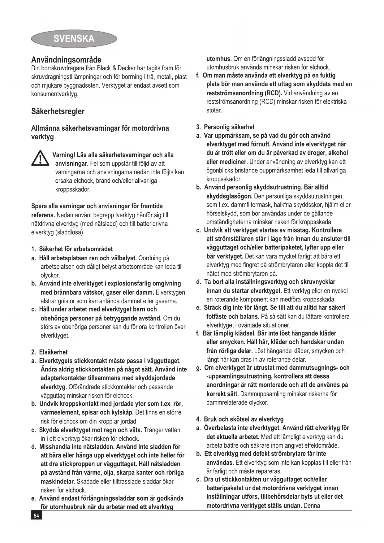 Varning! Läs alla säkerhetsvarningar och alla anvisningar. Fel som uppstår till följd av att varningarna och anvisningarna nedan inte följts kan orsaka elchock, brand och/eller allvarliga kroppsskador. Spara alla varningar och anvisningar för framtida referens. Nedan använt begrepp lverktyg hänför sig till nätdrivna elverktyg (med nätsladd) och till batteridrivna elverktyg (sladdlösa).