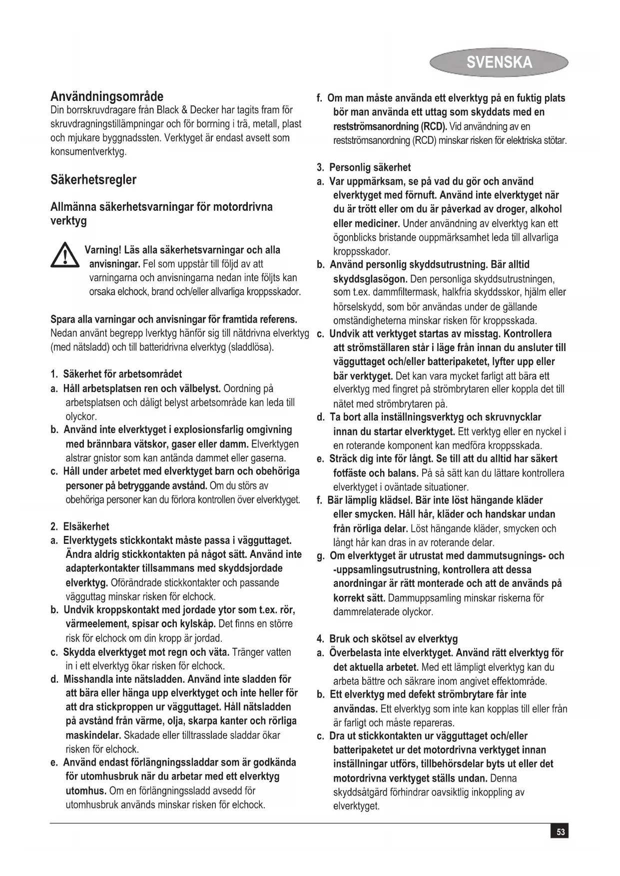 Kevin Hewitt Director of Consumer Engineering Spennymoor, County Durham DL16 6JG, Storbrittannien 23-3-2009 Reservdelar / reparationer Reservdelar nns att köpa hos auktoriserade Black & Decker verkstäder, som även ger kostnadsförslag och reparerar våra produkter. Förteckning över våra auktoriserade verkstäder nns på Internet, vår hemsida www.blackanddecker.se samt www.2helpU.com Garanti Black & Decker garanterar att produkten är fri från material- och/eller fabrikationsfel vid leverans till kund. Garantin är i tillägg till konsumentens lagliga rättigheter och påverkar inte dessa. Garantin gäller inom medlemsstaterna i Europeiska Unionen och i det Europeiska Frihandelsområdet. Om en Black & Decker produkt går sönder på grund av material- och/eller fabrikationsfel eller brister i överensstämmelse med specikationen, inom 24 månader från köpet, åtar sig Black & Decker att reparera eller byta ut produkten med minsta besvär för kunden. Garantin gäller inte för fel som beror på: u normalt slitageu felaktig användning eller skötselu att produkten skadats av främmande föremål, ämnen eller genom olyckshändelse Garantin gäller inte om reparation har utförts av någon annan än en auktoriserad Black & Decker verkstad. För att utnyttja garantin skall produkten och inköpskvittot lämnas till återförsäljaren eller till en auktoriserad verkstad senast 2 månader efter det att felet har upptäckts. För information om närmaste auktoriserad verkstad; kontakta det lokala Black & Decker kontoret på den adress som är angiven i bruksanvisningen. En lista på alla auktoriserade verkstäder samt servicevillkor nns även tillgängligt på Internet, adress: www.2helpU.com Besök vår webbplats www.blackanddecker.se för att registrera din nya Black & Decker-produkt samt för att erhålla information om nya produkter och specialerbjudanden. Vidare information om märket Black & Decker och vårt produktsortiment kan åternnas på www.blackanddecker.se59 NORSK Bruksområder Black & Decker drill/skrutrekker er konstruert for skruing og boring i tre, metall, plast og mur. Verktøyet er tiltenkt kun som konsumentverktøy. Sikkerhetsinstruksjoner Generelle sikkerhetsadvarsler for elektroverktøy