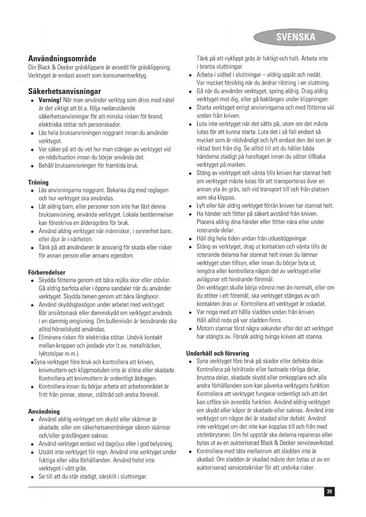 PORTUGUÊS Kevin Hewitt Director de Engenharia do Consumo Spennymoor, County Durham DL16 6JG, Reino Unido 1-8-2004 Garantia A Black & Decker confia na qualidade de seus produtos e oferece um programa de garantia excelente. Esta declaração de garantia soma-se aos seus direitos legais e não os prejudica em nenhum aspecto. A garantia será válida nos territórios dos Estados Membros da União Europeia e na Área de Livre Comércio da Europa. Caso algum produto da Black & Decker apresente avarias devido a defeitos de material, mão-de-obra ou ausência de conformidade no prazo de 24 meses a partir da data de compra, a Black & Decker garantirá a substituição das peças defeituosas, a reparação dos produtos que foram submetidos a uso adequado e remoção ou substituição dos mesmos para assegurar o mínimo de inconvenientes ao cliente a menos que: ◆ O produto tenha sido utilizado para fins comerciais, profissionais ou aluguer; ◆ O produto tenha sido submetido a uso incorrecto ou descuido; ◆ O produto tenha sofrido danos causados por objectos estranhos, substâncias ou acidentes; ◆ Tenha um histórico de reparacões efectuadas por terceiros que não sejam os agentes autorizados ou profissionais de manutenção da Black & Decker. Para activar a garantia, será necessário enviar a prova de compra ao revendedor ou agente de reparação autorizado. Para verificar a localização do agente de reparação mais próximo de si contacte o escritório local da Black & Decker no endereço indicado neste manual. Se preferir, consulte a lista de agentes autorizados da Black & Decker e os dados completos de nossos serviços de atendimento pós-venda na Internet no endereço: www.2helpU.com Visite o nosso website www.blackanddecker.com para registar o seu novo produto Black & Decker e para se manter actualizado sobre novos produtos e ofertas especiais. Estão disponíveis mais informações sobre a Black & Decker e sobre a nossa gama de produtos em www.blackanddecker.com39 SVENSKA Användningsområde Din Black & Decker gräsklippare är avsedd för gräsklippning. Verktyget är endast avsett som konsumentverktyg. Säkerhetsanvisningar ◆ Varning! När man använder verktyg som drivs med nätel är det viktigt att bl.a. följa nedanstående säkerhetsanvisningar för att minska risken för brand, elektriska stötar och personskador. ◆ Läs hela bruksanvisningen noggrant innan du använder verktyget. ◆ Var säker på att du vet hur man stänger av verktyget vid en nödsituation innan du börjar använda det. ◆ Behåll bruksanvisningen för framtida bruk. Träning ◆ Läs anvisningarna noggrant. Bekanta dig med reglagen och hur verktyget ska användas. ◆ Låt aldrig barn, eller personer som inte har läst denna bruksanvisning, använda verktyget. Lokala bestämmelser kan föreskriva en åldersgräns för bruk. ◆ Använd aldrig verktyget när människor, i synnerhet barn, eller djur är i närheten. ◆ Tänk på att användaren är ansvarig för skada eller risker för annan person eller annans egendom. Förberedelser ◆ Skydda fötterna genom att bära rejäla skor eller stövlar. Gå aldrig barfota eller i öppna sandaler när du använder verktyget. Skydda benen genom att bära långbyxor. ◆ Använd skyddsglasögon under arbetet med verktyget. Bär ansiktsmask eller dammskydd om verktyget används i en dammig omgivning. Om bullernivån är besvärande ska alltid hörselskydd användas. ◆ Eliminera risken för elektriska stötar. Undvik kontakt mellan kroppen och jordade ytor (t.ex. metallräcken, lyktstolpar m.m.). ◆ Syna verktyget före bruk och kontrollera att kniven, knivmuttern och klippmodulen inte är slitna eller skadade. Kontrollera att knivmuttern är ordentligt åtdragen. ◆ Kontrollera innan du börjar arbeta att arbetsområdet är fritt från pinnar, stenar, ståltråd och andra föremål. Användning ◆ Använd aldrig verktyget om skydd eller skärmar är skadade, eller om säkerhetsanordningar såsom skärmar och/eller gräsfångare saknas. ◆ Använd verktyget endast vid dagsljus eller i god belysning. ◆ Utsätt inte verktyget för regn. Använd inte verktyget under fuktiga eller våta förhållanden. Använd helst inte verktyget i vått gräs. ◆ Se till att du står stadigt, särskilt i sluttningar. Tänk på att nyklippt gräs är fuktigt och halt. Arbeta inte i branta sluttningar. ◆ Arbeta i sidled i sluttningar – aldrig uppåt och nedåt. Var mycket försiktig när du ändrar riktning i en sluttning. ◆ Gå när du använder verktyget, spring aldrig. Drag aldrig verktyget mot dig, eller gå baklänges under klippningen. ◆ Starta verktyget enligt anvisningarna och med fötterna väl undan från kniven. ◆ Luta inte verktyget när det sätts på, utom om det måste lutas för att kunna starta. Luta det i så fall endast så mycket som är nödvändigt och lyft endast den del som är riktad bort från dig. Se alltid till att du håller båda händerna stadigt på handtaget innan du sätter tillbaka verktyget på marken. ◆ Stäng av verktyget och vänta tills kniven har stannat helt om verktyget måste lutas för att transporteras över en annan yta än gräs, och vid transport till och från platsen som ska klippas. ◆ Lyft eller bär aldrig verktyget förrän kniven har stannat helt. ◆ Ha händer och fötter på säkert avstånd från kniven. Placera aldrig dina händer eller fötter nära eller under roterande delar. ◆ Håll dig hela tiden undan från utkastöppningar. ◆ Stäng av verktyget, drag ut kontakten och vänta tills de roterande delarna har stannat helt innan du lämnar verktyget utan tillsyn, eller innan du börjar byta ut, rengöra eller kontrollera någon del av verktyget eller avlägsnar ett hindrande föremål. Om verktyget skulle börja vibrera mer än normalt, eller om du stöter i ett föremål, ska verktyget stängas av och kontakten dras ur. Kontrollera att verktyget är oskadat. ◆ Var noga med att hålla sla