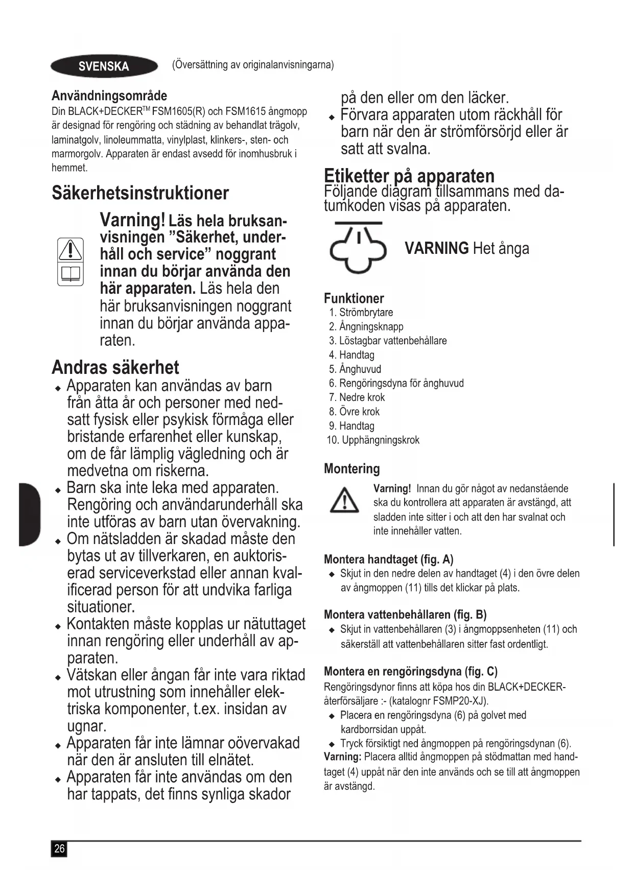 Varning! Läs hela bruksan- visningen ”Säkerhet, under- håll och service” noggrant innan du börjar använda den här apparaten. Läs hela den här bruksanvisningen noggrant innan du börjar använda appa- raten. Andras säkerhet u Apparaten kan användas av barn från åtta år och personer med ned- satt fysisk eller psykisk förmåga eller bristande erfarenhet eller kunskap, om de får lämplig vägledning och är medvetna om riskerna. u Barn ska inte leka med apparaten. Rengöring och användarunderhåll ska inte utföras av barn utan övervakning. u Om nätsladden är skadad måste den bytas ut av tillverkaren, en auktoris- erad serviceverkstad eller annan kval- icerad person för att undvika farliga situationer. u Kontakten måste kopplas ur nätuttaget innan rengöring eller underhåll av ap- paraten. u Vätskan eller ångan får inte vara riktad mot utrustning som innehåller elek- triska komponenter, t.ex. insidan av ugnar. u Apparaten får inte lämnar oövervakad när den är ansluten till elnätet. u Apparaten får inte användas om den har tappats, det nns synliga skador på den eller om den läcker. u Förvara apparaten utom räckhåll för barn när den är strömförsörjd eller är satt att svalna. Etiketter på apparaten Följande diagram tillsammans med da- tumkoden visas på apparaten. VARNING Het ånga Funktioner 1. Strömbrytare 2. Ångningsknapp 3. Löstagbar vattenbehållare 4. Handtag 5. Ånghuvud 6. Rengöringsdyna för ånghuvud 7. Nedre krok 8. Övre krok 9. Handtag 10. Upphängningskrok Montering Varning! Innan du gör något av nedanstående ska du kontrollera att apparaten är avstängd, att sladden inte sitter i och att den har svalnat och inte innehåller vatten. Montera handtaget (g. A) u Skjut in den nedre delen av handtaget (4) i den övre delen av ångmoppen (11) tills det klickar på plats. Montera vattenbehållaren (g. B) u Skjut in vattenbehållaren (3) i ångmoppsenheten (11) och säkerställ att vattenbehållaren sitter fast ordentligt. Montera en rengöringsdyna (g. C) Rengöringsdynor nns att köpa hos din BLACK+DECKER-återförsäljare :- (katalognr FSMP20-XJ).u Placera en rengöringsdyna (6) på golvet med kardborrsidan uppåt.u Tryck försiktigt ned ångmoppen på rengöringsdynan (6).Varning: Placera alltid ångmoppen på stödmattan med hand-taget (4) uppåt när den inte används och se till att ångmoppen är avstängd.27 (Översättning av originalanvisningarna) SVENSKA Avlägsna en rengöringsdyna Varning! Använd alltid lämpliga skor när du byter rengörings- dyna på ångmoppen. Använd inte tofor eller öppna skor. u Sätt tillbaka handtaget (4) i upprätt läge och stäng AV ångmoppen. u Vänta tills ångmoppen har svalnat (cirka 5 minuter). u Lyft upp ångmoppen från rengöringsdynan så att den släp- per från kardborrfästet. Varning! Placera alltid ångmoppen på stödmattan med hand- taget (4) uppåt när den inte används och se till att ångmoppen är avstängd. Fylla vattenbehållaren (g. D) Ångmoppens vattenbehållare är löstagbar för enkel och bekväm påfyllning. Obs! Fyll vattenbehållaren med rent kranvatten. Obs! I områden med hårt vatten rekommenderas att du använder avjoniserat vatten. u Avlägsna vattenbehållaren (3). u Avlägsna påfyllningslocket genom att skruva det moturs. u Fyll behållaren (3) med vatten. Varning! Vattenbehållaren rymmer 350 ml. Fyll inte på för mycket vatten i vattenbehållaren. u Sätt fast påfyllningslocket genom att skruva det medurs. u Sätt tillbaka vattenbehållaren (3). Obs! Kontrollera att påfyllningslocket sitter fast ordentligt. Obs! Använd inte kemiska rengöringsmedel i ångmoppens vattenbehållare. Användning Viktigt! Den här apparaten dödar 99,9% av alla bakterier om den används enligt anvisningarna i den här manualen med mikroberdynan monterad och en kontinuerlig körtid på 90 sekunder. Slå på och av u Starta apparaten genom att trycka på PÅ-/AV-knappen (1). Det tar cirka 15 sekunder för ångmoppen att värmas upp. u Tryck på ångningsknappen (2). Detta försätter pumpen i driftläge och enheten börjar producera ånga. u För att stoppa ångproduktionen sätter du ångningsknap- pen (2) i läget AV. På så vis avbryts inte strömförsörjnin- gen till pannan, så att det går snabbare att starta. u Stäng av apparaten genom att trycka på PÅ/AV-knappen (1). Varning! Lämna aldrig ångmoppen på samma plats på ytan under längre tid. Placera alltid ångmoppen på stödmattan med handtaget (4) uppåt när den inte används och se till att den är avstängd. Varning! Töm alltid ångmoppen när du är klar. Obs! När du fyller på vatten för första gången eller när vattnet har tagit slut kan det ta upp till 45 sekunder innan ånga bildas. Tips för optimal användning Allmänt Varning: Använd aldrig ångmoppen utan att först montera en rengöringsdyna. u Dammsug eller sopa golvet innan du använder ångmop- pen. u Det enklaste sättet att använda apparaten är att luta handtaget 45° och sedan försiktigt och långsamt rengöra en liten yta åt gången. u Använd inte kemiska rengöringsmedel med ångmoppen. Om du ska ta bort besvärliga äckar från vinyl- eller linole- umgolv kan du förbehandla med ett milt rengöringsmedel innan du använder ångmoppen. Ångrengöring u Placera en rengöringsdyna (6) på golvet med kardborrsidan uppåt. u Tryck försiktigt ned ångmoppen på rengöringsdynan (6). u Anslut ångmoppen till elnätet. u Tryck på strömbrytaren (1). Det tar cirka 15 sekunder för ångmoppen att värmas upp. u Tryck på ångningsknappen (2). Efter några sekunder börjar ånga att strömma ut ur ånghuvudet. Obs! När du fyller på vatten för första gången eller när vattnet har tagit slut kan det ta upp till 45 sekunder innan ånga bildas. u Det tar några sekunder för ångan att komma in i rengöringsdynan. Ångmoppen glider nu lätt över ytan som ska saneras/rengöras. u Skjut och dra ångmoppen försiktigt f