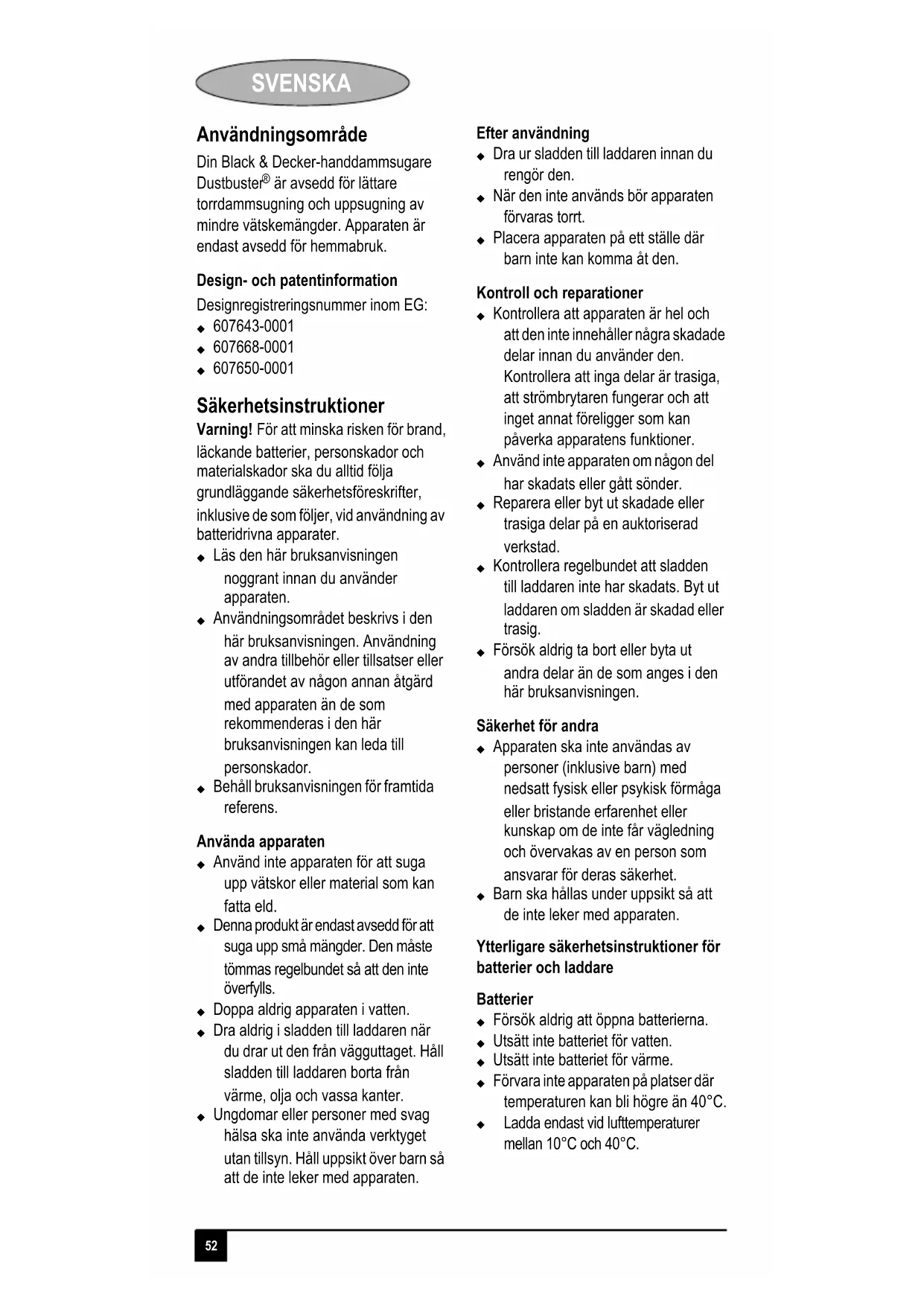 Anvand laddaren fran Black & Decker endast for att ladda batteriet i den apparat som laddaren levererades med. Andra batterier kan spricka och orsaka personskador och andra skador.