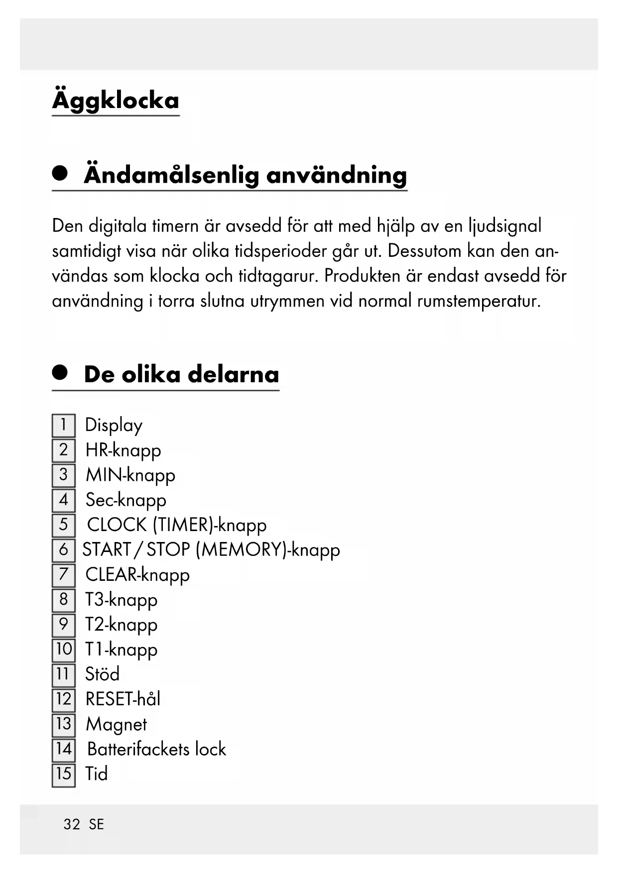 Ändamålsenlig användning Den digitala timern är avsedd för att med hjälp av en ljudsignal samtidigt visa när olika tidsperioder går ut. Dessutom kan den an- vändas som klocka och tidtagarur. Produkten är endast avsedd för användning i torra slutna utrymmen vid normal rumstemperatur.