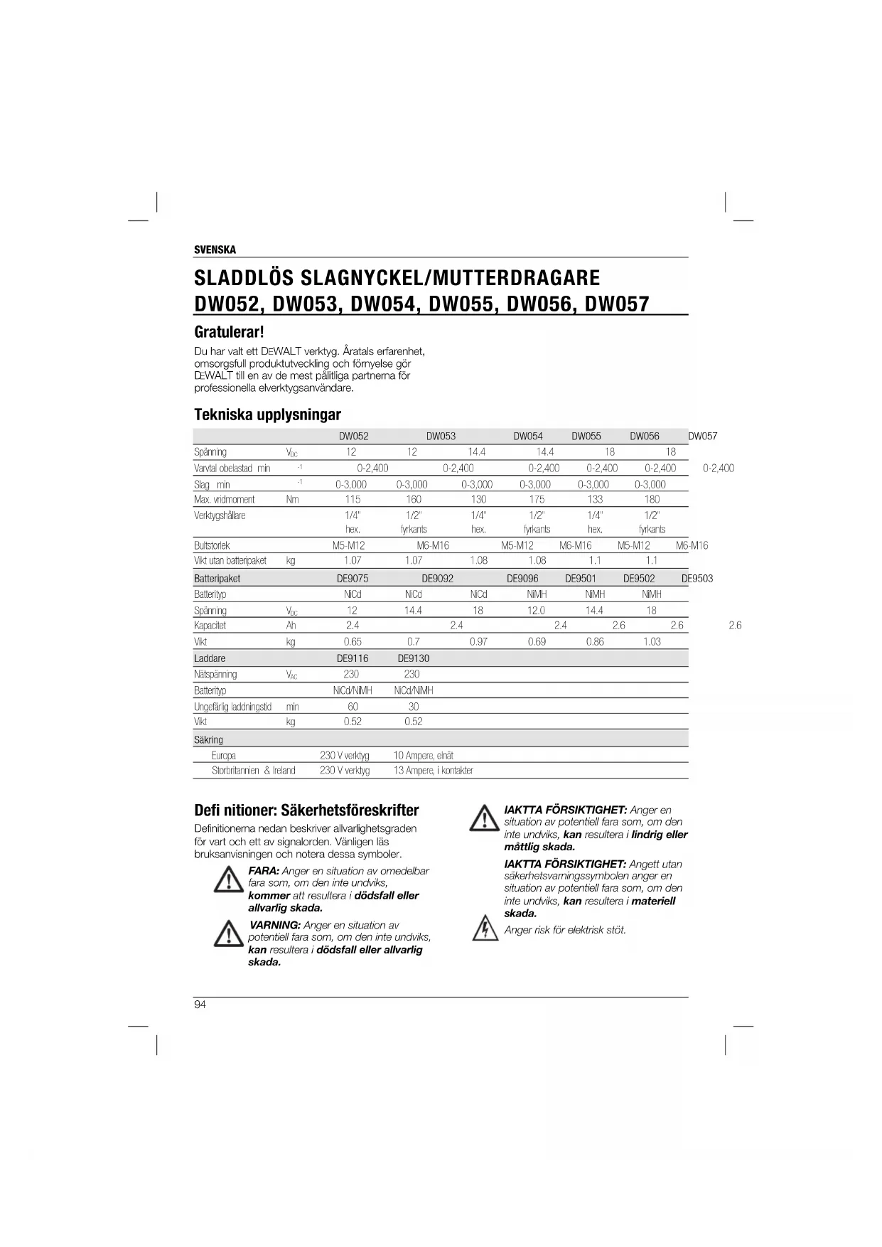 DW052, DW053, DW054, DW055, DW056 och DW057 Sladdlösa slagnycklar/mutterdragare är utformade för professionell drivning av skruvar och muttrar. Slagfunktionen gör det här verktyget speciellt användbart för drivning av fästelement i trä, metall och betong. ANVÄND INTE i fuktiga miljöer, eller i närhet av lättantändliga vätskor eller gaser. De sladdlösa slagnycklarna/mutterdragarna är professionella elverktyg. TILLÅT INTE barn att komma i kontakt med verktyget. Uppsikt krävs då det används av ungdomar under 16 år. a. Strömbrytare med hastighetsvariation b. Framåt/back reglage c. Verktygshållare d. Pistolhandtag e. Batteripaket f. Frigörningsknappar g. Laddare h. Laddningssignal (röd) Laddare Din DE9130 laddare fungerar för DEWALT NiCd batteripaket på 7,2 till 14,4 V. Din DE9116 laddare fungerar för DEWALT NiCd/NiMH batteripaket på 7,2 till 18 V. Elsäkerhet Den elektriska motorn har utformats enbart för en spänning. Kontrollera alltid att batteripaketets spänning motsvarar spänningen på märkplåten. Försäkra dig också om att spänningen hos din laddare motsvarar spänningen i ditt elnät. Din DEWALT laddare är dubbelisolerad i enlighet med EN 60335. Användning av förlängningssladd Förlängningssladd bör inte användas utom då det är absolut nödvändigt. Använd en godkänd förlängningssladd som är lämpad för din laddares elintag (se tekniska upplysningar). Minimum ledningsstorlek är 1 mm