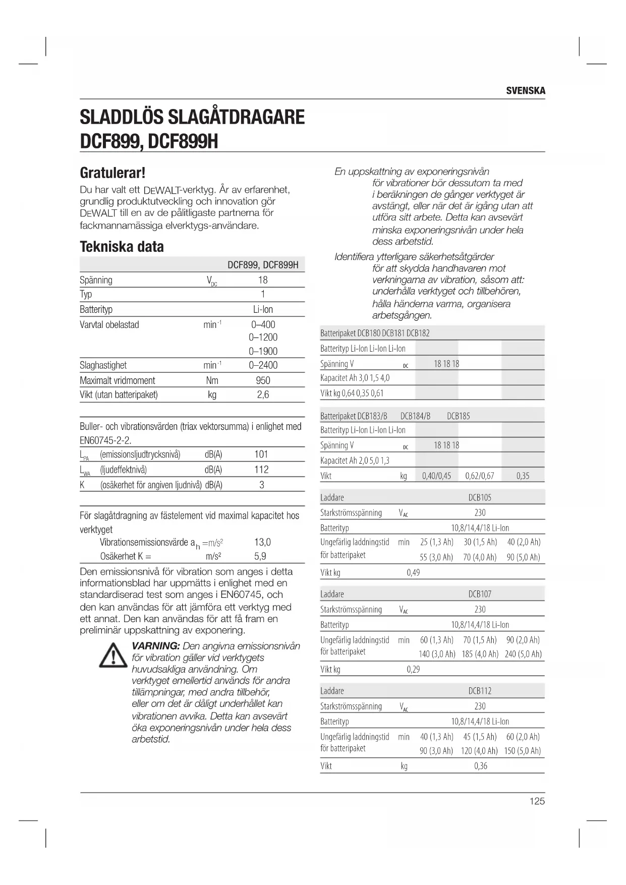 Batterityp 10,8/14,4/18 Li-Ion Ungefärlig laddningstid för batteripaket min 40 (1,3 Ah) 45 (1,5 Ah) 60 (2,0 Ah) 90 (3,0 Ah) 120 (4,0 Ah) 150 (5,0 Ah) Vikt kg 0,36 Gratulerar! Du har valt ett DeWALT -verktyg. År av erfarenhet, grundlig produktutveckling och innovation gör DeWALT till en av de pålitligaste partnerna för fackmannamässiga elverktygs-användare. Tekniska data