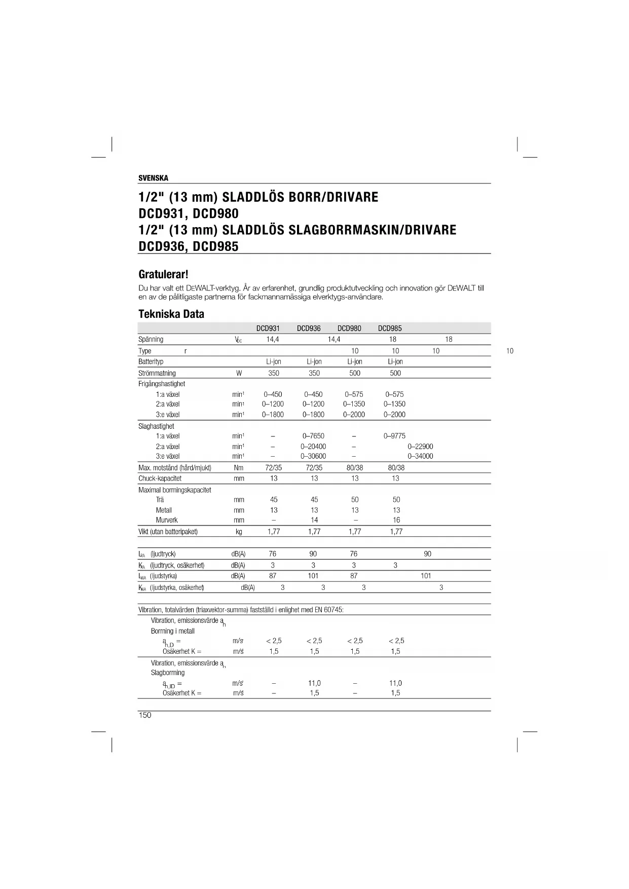 1/2" (13 mm) SLADDLÖS BORR/DRIVARE DCD931, DCD980 1/2" (13 mm) SLADDLÖS SLAGBORRMASKIN/DRIVARE DCD936, DCD985 Gratulerar! Du har valt ett DEWALT-verktyg. År av erfarenhet, grundlig produktutveckling och innovation gör DEWALT till en av de pålitligaste partnerna för fackmannamässiga elverktygs-användare. Tekniska Data