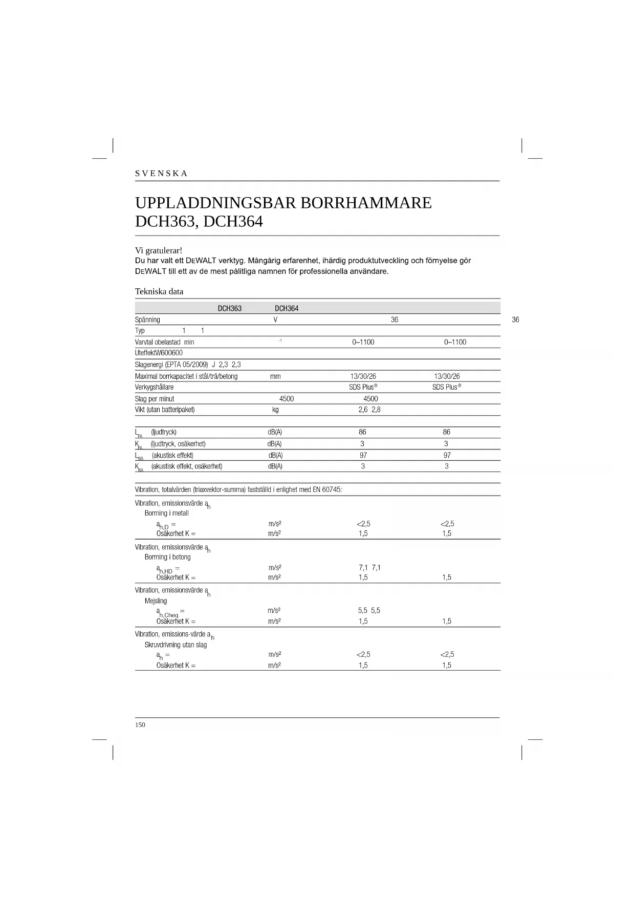 EWALT-huoltokorjaamoista ja myynnin jälkeisestä palvelusta on Internet-sivustossa: www.2helpU.com.150 SVENSKA UPPLADDNINGSBAR BORRHAMMARE DCH363, DCH364 Vi gratulerar! Du har valt ett DEWALT verktyg. Mångårig erfarenhet, ihärdig produktutveckling och förnyelse gör DEWALT till ett av de mest pålitliga namnen för professionella användare. Tekniska data DCH363 DCH364 Spänning V 36 36 Typ 1 1 Varvtal obelastad min