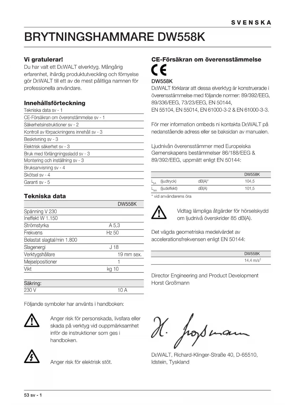 Vi gratulerar! Du har valt ett DEWALT elverktyg. Mångårig erfarenhet, ihärdig produktutveckling och förnyelse gör DEWALT till ett av de mest pålitliga namnen för professionella användare. Innehållsförteckning Tekniska data sv - 1 CE-Försäkran om överenstämmelse sv - 1 Säkerhetsinstruktioner sv - 2 Kontroll av förpackningens innehåll sv - 3 Beskrivning sv - 3 Elektrisk säkerhet sv - 3 Bruk med förlängningssladd sv - 3 Montering och inställning sv - 3 Bruksanvisning sv - 4 Skötsel sv - 4 Garanti sv - 5 Tekniska data DW558K Spänning V 230 Ineffekt W 1.150 Strömstyrka A 5,3 Frekvens Hz 50 Belastat slagtal/min 1.800 Slagenergi J 18 Verktygshållare 19 mm sex. Mejselpositioner 1 Vikt kg 10 Säkring: 230 V 10 A Följande symboler har använts i handboken: Anger risk för personskada, livsfara eller skada på verktyg vid ouppmärksamhet inför de instruktioner som ges i handboken. Anger risk för elektrisk stöt. CE-Försäkran om överensstämmelse DW558K DEWALT förklarar att dessa elverktyg är konstruerade i överensstämmelse med följande normer: 89/392/EEG, 89/336/EEG, 73/23/EEG, EN 50144, EN 55104, EN 55014, EN 61000-3-2 & EN 61000-3-3. För mer information ombeds ni kontakta DEWALT på nedanstående adress eller se baksidan av manualen. Ljudnivån överensstämmer med Europeiska Gemenskapens bestämmelser 86/188/EEG & 89/392/EEG, uppmätt enligt EN 50144: DW558K
