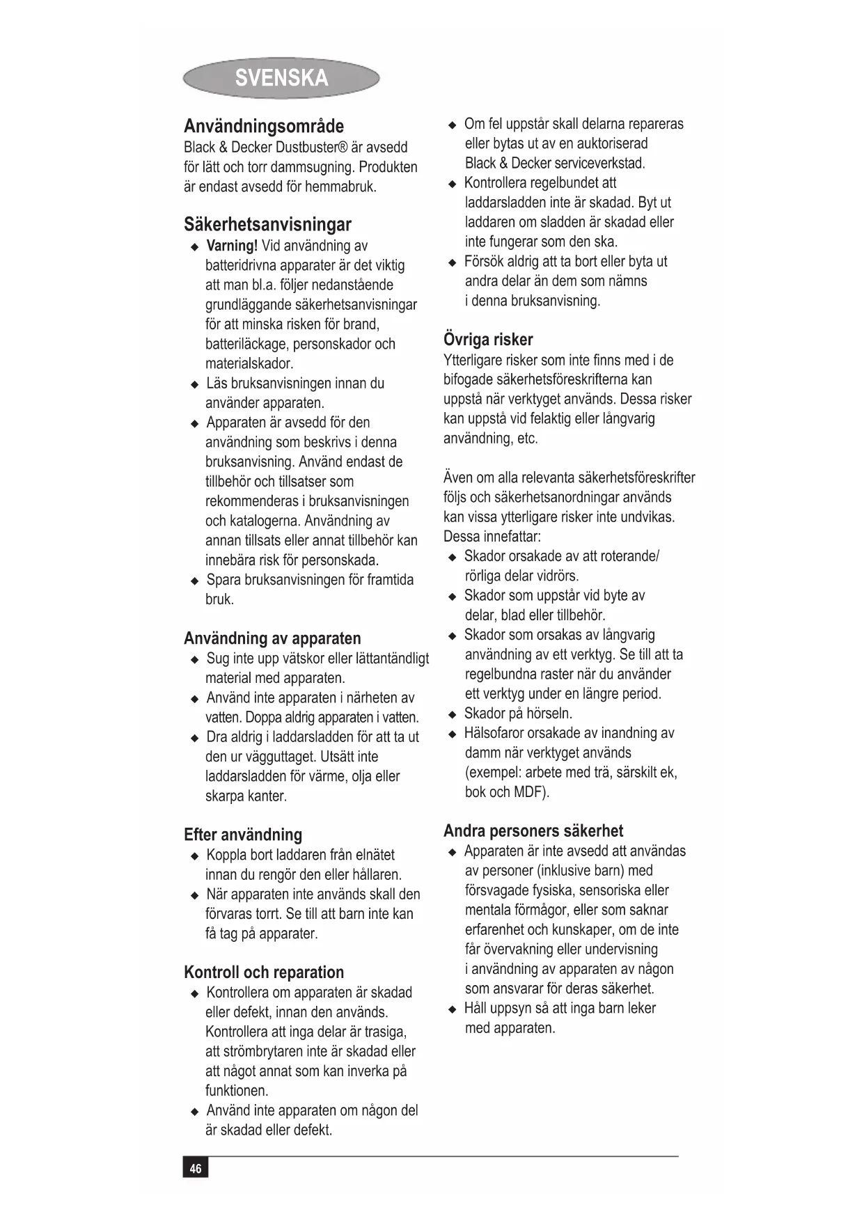 PORTUGUÊS Garantia A Black & Decker cona na qualidade de seus produtos e oferece um programa de garantia excelente. Esta declaração de garantia soma-se aos seus direitos legais e não os prejudica em nenhum aspecto. A garantia será válida nos territórios dos Estados Membros da União Europeia e na Área de Livre Comércio da Europa. Caso algum produto da Black & Decker apresente avarias devido a defeitos de material, mão-de-obra ou ausência de conformidade no prazo de 24 meses a partir da data de compra, a Black & Decker garantirá a substituição das peças defeituosas, a reparação dos produtos que foram submetidos a uso adequado e remoção ou substituição dos mesmos para assegurar o mínimo de inconvenientes ao cliente a menos que: u O produto tenha sido utilizado para ns comerciais, prossionais ou aluguer; u O produto tenha sido submetido a uso incorrecto ou descuido; u O produto tenha sofrido danos causados por objectos estranhos, substâncias ou acidentes; u Tenha um histórico de reparacões efectuadas por terceiros que não sejam os agentes autorizados ou prossionais de manutenção da Black & Decker. Para activar a garantia, será necessário enviar a prova de compra ao revendedor ou agente de reparação autorizado. Para vericar a localização do agente de reparação mais próximo de si contacte o escritório local da Black & Decker no endereço indicado neste manual. Se preferir, consulte a lista de agentes autorizados da Black & Decker e os dados completos de nossos serviços de atendimento pós-venda na Internet no endereço: www.2helpU.com Visite o nosso website www.blackanddecker.eu para registar o seu novo produto Black & Decker e para se manter actualizado sobre novos produtos e ofertas especiais. Estão disponíveis mais informações sobre a Black & Decker e sobre a nossa gama de produtos em www.blackanddecker.eu46 SVENSKA Användningsområde Black & Decker Dustbuster® är avsedd för lätt och torr dammsugning. Produkten är endast avsedd för hemmabruk. Säkerhetsanvisningar u Varning! Vid användning av batteridrivna apparater är det viktig att man bl.a. följer nedanstående grundläggande säkerhetsanvisningar för att minska risken för brand, batteriläckage, personskador och materialskador. u Läs bruksanvisningen innan du använder apparaten. u Apparaten är avsedd för den användning som beskrivs i denna bruksanvisning. Använd endast de tillbehör och tillsatser som rekommenderas i bruksanvisningen och katalogerna. Användning av annan tillsats eller annat tillbehör kan innebära risk för personskada. u Spara bruksanvisningen för framtida bruk. Användning av apparaten u Sug inte upp vätskor eller lättantändligt material med apparaten. u Använd inte apparaten i närheten av vatten. Doppa aldrig apparaten i vatten. u Dra aldrig i laddarsladden för att ta ut den ur vägguttaget. Utsätt inte laddarsladden för värme, olja eller skarpa kanter. Efter användning u Koppla bort laddaren från elnätet innan du rengör den eller hållaren. u När apparaten inte används skall den förvaras torrt. Se till att barn inte kan få tag på apparater. Kontroll och reparation u Kontrollera om apparaten är skadad eller defekt, innan den används. Kontrollera att inga delar är trasiga, att strömbrytaren inte är skadad eller att något annat som kan inverka på funktionen. u Använd inte apparaten om någon del är skadad eller defekt. u Om fel uppstår skall delarna repareras eller bytas ut av en auktoriserad Black & Decker serviceverkstad. u Kontrollera regelbundet att laddarsladden inte är skadad. Byt ut laddaren om sladden är skadad eller inte fungerar som den ska. u Försök aldrig att ta bort eller byta ut andra delar än dem som nämns i denna bruksanvisning. Övriga risker Ytterligare risker som inte nns med i de bifogade säkerhetsföreskrifterna kan uppstå när verktyget används. Dessa risker kan uppstå vid felaktig eller långvarig användning, etc. Även om alla relevanta säkerhetsföreskrifter följs och säkerhetsanordningar används kan vissa ytterligare risker inte undvikas. Dessa innefattar: u Skador orsakade av att roterande/ rörliga delar vidrörs. u Skador som uppstår vid byte av delar, blad eller tillbehör. u Skador som orsakas av långvarig användning av ett verktyg. Se till att ta regelbundna raster när du använder ett verktyg under en längre period. u Skador på hörseln.u Hälsofaror orsakade av inandning av damm när verktyget används (exempel: arbete med trä, särskilt ek, bok och MDF). Andra personers säkerhet u Apparaten är inte avsedd att användas av personer (inklusive barn) med försvagade fysiska, sensoriska eller mentala förmågor, eller som saknar erfarenhet och kunskaper, om de inte får övervakning eller undervisning i användning av apparaten av någon som ansvarar för deras säkerhet. u Håll uppsyn så att inga barn leker med apparaten.47 SVENSKA Tillkommande säkerhetsanvisningar för batterier och laddare Batterier u Försök aldrig öppna.u Låt inte batteriet komma i kontakt med vatten. u Exponera inte batteriet för värme.u Förvara inte batteriet i utrymmen där temperaturen kan överstiga 40 °C. u Ladda endast inom temperaturområdet 10 °C till 40 °C. u Ladda endast med laddaren som medföljer. u När batterierna kasseras skall instruktionerna i kapitlet "Miljöskydd" följas. u Se till att inte skada eller deformera batteriet genom perforering eller stötar, eftersom det kan leda till risk för personskada och brand. u Försök aldrig ladda skadade batterier.u Under extrema förhållanden kan batteriet läcka. Om du upptäcker vätska från batteriet skall följande iakttagas: u Torka försiktigt bort vätskan med en trasa. Undvik kontakt med huden. u Vid kontakt med huden eller ögonen skall instruktionerna nedan följas. Varning! Batterivätskan kan orsaka personskador eller skador på egendom. Skölj omedelbart med vatten vid kontakt med huden. Den som drabbas av rodnad,