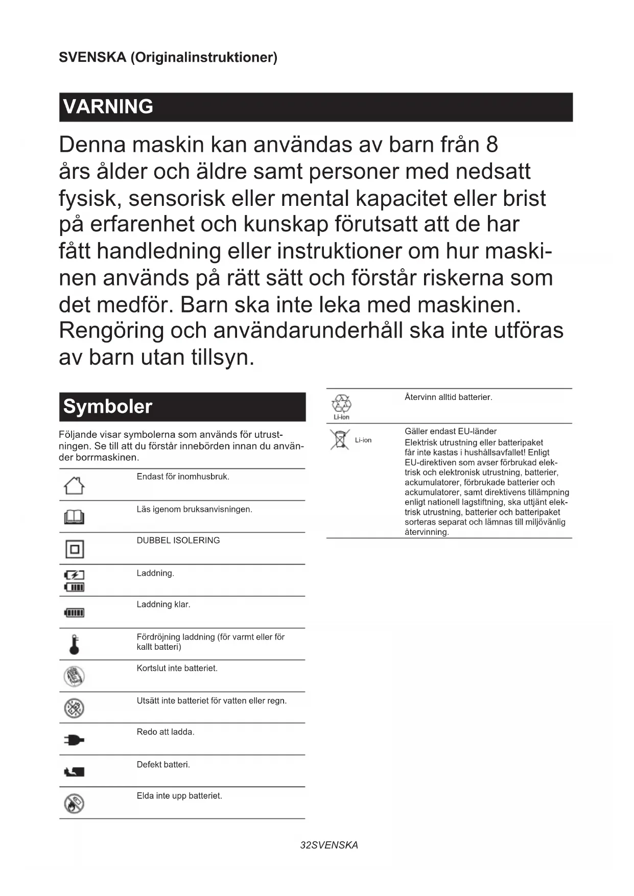 - Soğuk havaya maruz kalan bir yerde uzun süre bırakılmış batarya kartuşu. Batarya kartuşu sıcaklığı, şarjın mümkün olduğu dereceye ulaştığında şarj başlar. NOT: Şarj ışığı dönüşümlü olarak yeşil ve kırmızı renkte yanıp sönerse şarj mümkün değildir. Şarj aleti veya batarya kartuşu üzerindeki terminaller tozla tıkanmıştır veya batarya kartuşu eskimiş veya hasarlıdır.32 SVENSKA SVENSKA (Originalinstruktioner) VARNING Denna maskin kan användas av barn från 8 års ålder och äldre samt personer med nedsatt fysisk, sensorisk eller mental kapacitet eller brist på erfarenhet och kunskap förutsatt att de har fått handledning eller instruktioner om hur maski- nen används på rätt sätt och förstår riskerna som det medför. Barn ska inte leka med maskinen. Rengöring och användarunderhåll ska inte utföras av barn utan tillsyn. Symboler Följande visar symbolerna som används för utrust- ningen. Se till att du förstår innebörden innan du använ- der borrmaskinen. Endast för inomhusbruk. Läs igenom bruksanvisningen. DUBBEL ISOLERING Laddning. Laddning klar. Fördröjning laddning (för varmt eller för kallt batteri) Kortslut inte batteriet. Utsätt inte batteriet för vatten eller regn. Redo att ladda. Defekt batteri. Elda inte upp batteriet. Återvinn alltid batterier. Li-ion Gäller endast EU-länder Elektrisk utrustning eller batteripaket får inte kastas i hushållsavfallet! Enligt EU-direktiven som avser förbrukad elek- trisk och elektronisk utrustning, batterier, ackumulatorer, förbrukade batterier och ackumulatorer, samt direktivens tillämpning enligt nationell lagstiftning, ska uttjänt elek- trisk utrustning, batterier och batteripaket sorteras separat och lämnas till miljövänlig återvinning.33 SVENSKA FÖRSIKTIGT