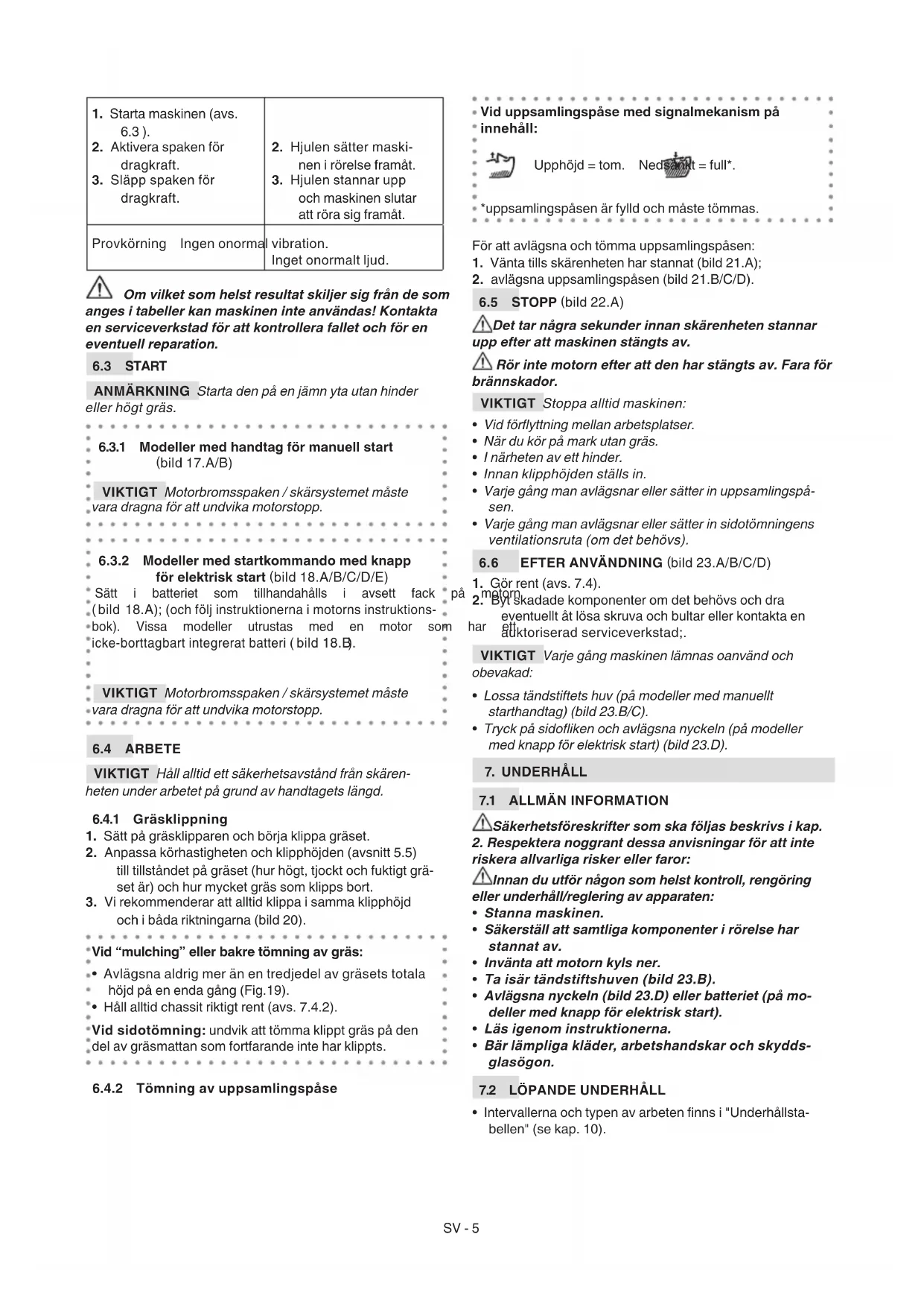 Ingrepp Intervall Anmärkningar MASKIN Kontroll av alla fästen säkerhetskontroller / kontroll av reglagen kontroll av skydden till bakre tömning / sidotömning; kontroll av uppsamlingspåse, sidotömningens riktplatta; kontroll av skärenheten;. Före användning avs. 6.2.2 Allmän rengöring och kontroll kontroll av eventuella skador som nns på maskinen. Kontakta en auktoriserad serviceverkstad vid behov. Vid slutet av var- je användning avs. 7.4 Byte av skärenheten - avs. 7.3.1 * MOTOR Kontroll / påfyllning av bränsle; Kontroll/påfyllning av motorolja Före användning avs. 6.1.1 / 7.2.1 * / 7.2.2 * Kontroll och rengöring av luftltret; Kontroll och rengöring av tändstiftskon- takterna; Byte av tändstift; Batteriladdning