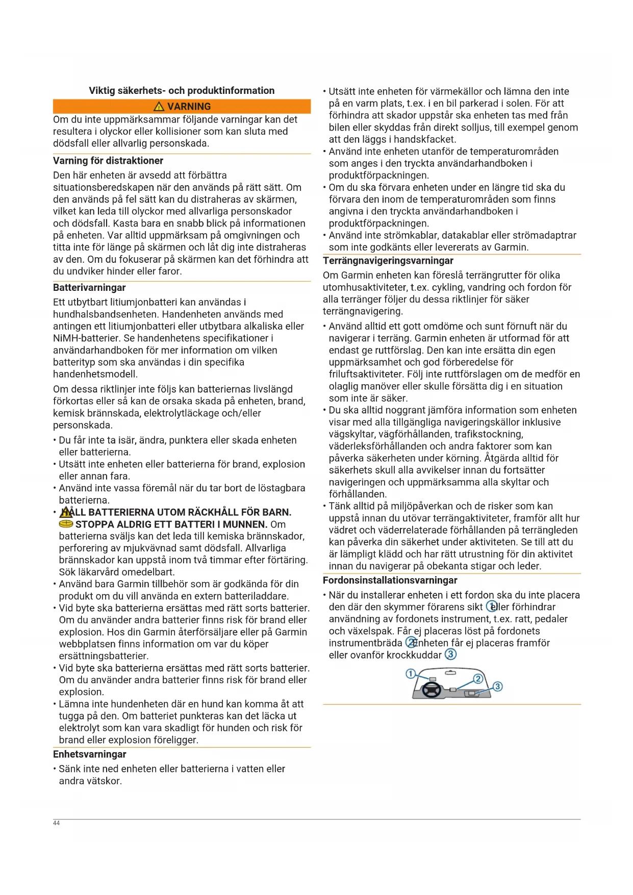 - När du installerar enheten i ett fordon ska du inte placera den där den skymmer förarens sikt eller förhindrar användning av fordonets instrument, t.ex. ratt, pedaler och växelspak. Får ej placeras löst på fordonets instrumentbräda . Enheten får ej placeras framför eller ovanför krockkuddar . 44Gatunavigeringsvarningar Om din Garmin enhet använder adresskartor och föreslår rutter som följer vägar ska du följa dessa riktlinjer för säker vägnavigering.
