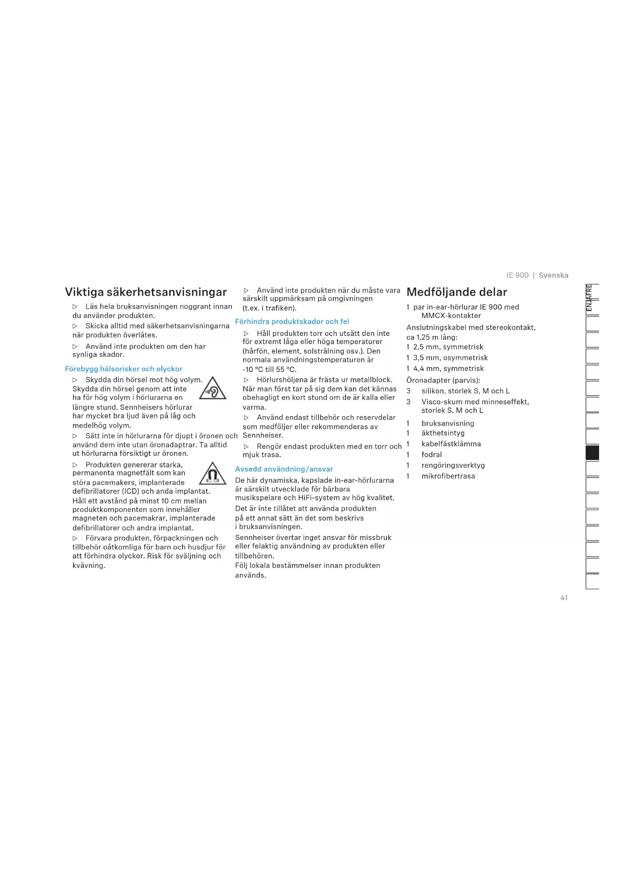 IE 900 | Svenska Viktiga säkerhetsanvisningar ▷ Läs hela bruksanvisningen noggrant innan du använder produkten. ▷ Skicka alltid med säkerhetsanvisningarna när produkten överlåtes. ▷ Använd inte produkten om den har synliga skador. Förebygg hälsorisker och olyckor ▷ Skydda din hörsel mot hög volym. Skydda din hörsel genom att inte ha för hög volym i hörlurarna en längre stund. Sennheisers hörlurar har mycket bra ljud även på låg och medelhög volym. ▷ Sätt inte in hörlurarna för djupt i öronen och använd dem inte utan öronadaptrar. Ta alltid ut hörlurarna försiktigt ur öronen. ▷ Produkten genererar starka, permanenta magnetfält som kan störa pacemakers, implanterade defibrillatorer (ICD) och anda implantat. Håll ett avstånd på minst 10 cm mellan produktkomponenten som innehåller magneten och pacemakrar, implanterade defibrillatorer och andra implantat. ▷ Förvara produkten, förpackningen och tillbehör oåtkomliga för barn och husdjur för att förhindra olyckor. Risk för sväljning och kvävning. ▷ Använd inte produkten när du måste vara särskilt uppmärksam på omgivningen (t.ex. i trafiken). Förhindra produktskador och fel ▷ Håll produkten torr och utsätt den inte för extremt låga eller höga temperaturer (hårfön, element, solstrålning osv.). Den normala användningstemperaturen är -10 °C till 55 °C. ▷ Hörlurshöljena är frästa ur metallblock. När man först tar på sig dem kan det kännas obehagligt en kort stund om de är kalla eller varma. ▷ Använd endast tillbehör och reservdelar som medföljer eller rekommenderas av Sennheiser. ▷ Rengör endast produkten med en torr och mjuk trasa. Avsedd användning/ansvar De här dynamiska, kapslade in-ear-hörlurarna är särskilt utvecklade för bärbara musikspelare och HiFi-system av hög kvalitet. Det är inte tillåtet att använda produkten på ett annat sätt än det som beskrivs i bruksanvisningen. Sennheiser övertar inget ansvar för missbruk eller felaktig användning av produkten eller tillbehören. Följ lokala bestämmelser innan produkten används. Medföljande delar 1 par in-ear-hörlurar IE 900 med MMCX-kontakter Anslutningskabel med stereokontakt, ca 1,25 m lång: 1 2,5 mm, symmetrisk 1 3,5 mm, osymmetrisk 1 4,4 mm, symmetrisk Öronadapter (parvis): 3 silikon, storlek S, M och L 3 Visco-skum med minneseffekt, storlek S, M och L 1 bruksanvisning 1 äkthetsintyg 1 kabelfästklämma 1 fodral 1 rengöringsverktyg 1 mikrofibertrasa42 Svenska | IE 900 Sennheiser IE 900 Mycket anspråksfulla musiklyssnare strävar alltid efter att hitta det perfekta ljudet. Den här passionen var inspirationen till IE 900 som är det nya flaggskeppet i Sennheisers in-ear- serie och som sätter nya standarder när det gäller ljudåtergivning. De snygga höljena, den förbättrade versionen av den prisade 7 mm XWB-omvandlaren och ljudkanalens överföringsegenskaper: Även de minsta detaljerna var viktiga under utvecklingen för att omsätta Sennheisers omfattande kunskaper om akustik i de här in-ear-hörlurarna. Den nya akustiska konstruktionen omfattar en förbättrad spole som optimerar prestandan vid höga frekvenser för ett briljant, naturligt ljud. Naturlig resonans och övertonsförvrängning minimeras tack vare en optimerad membranfolie. Kombinationen av dessa små förbättringar har lett till ett extremt naturligt ljud som även uppskattas av de mest anspråksfulla ljudentusiasterna. IE 900 tillverkas av experter på Sennheisers huvudfabrik i Tyskland och uppfyller strikta produktionstoleranser. Alla ljudomvandlare testas fullt ut två gånger, både separat och sedan tillsammans när vänster och höger hörlurssida har sammanförts. Ljudomvandlarna för höger och vänster sida väljs ut så att de är perfekt anpassade till varandra. Denna kärlek till detaljer är även uppenbar i den professionella, ljudinspirerade premiumkonstruktionen. Varje hölje fräses ut exakt ur ett helt block av högklassigt aluminium för att garantera hög ljudkvalitet och mycket lång hållbarhet. IE 900 kan även anslutas flexibelt tack vare Fidelity