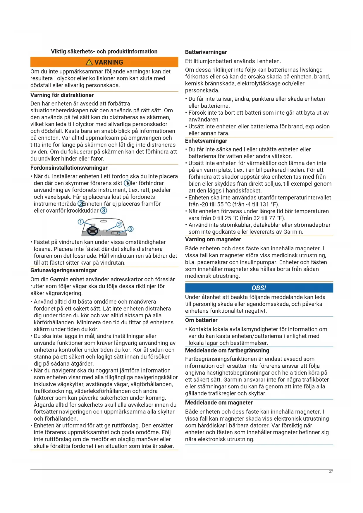 - När du installerar enheten i ett fordon ska du inte placera den där den skymmer förarens sikt eller förhindrar användning av fordonets instrument, t.ex. ratt, pedaler och växelspak. Får ej placeras löst på fordonets instrumentbräda . Enheten får ej placeras framför eller ovanför krockkuddar .