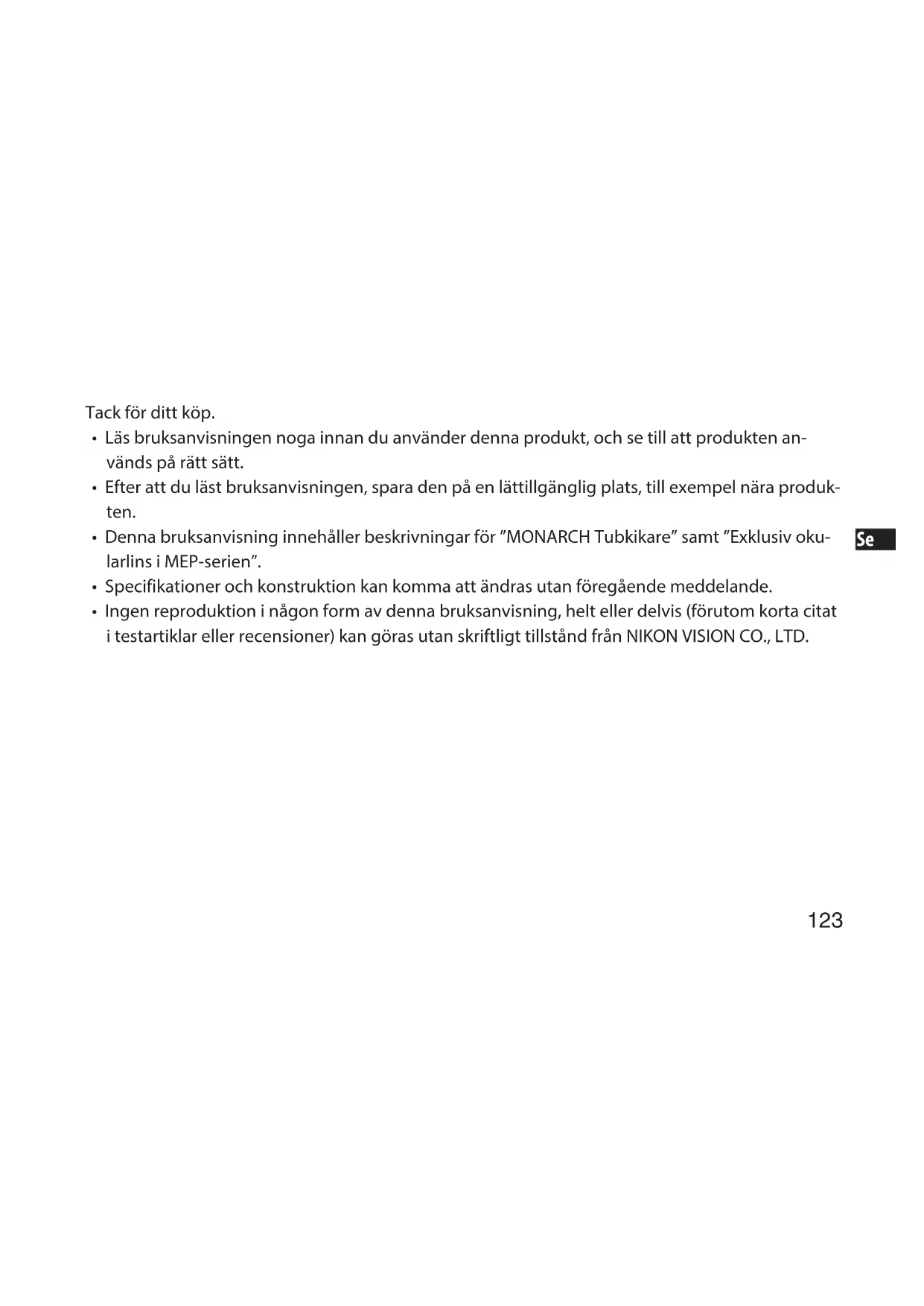 - Ingen reproduktion i någon form av denna bruksanvisning, helt eller delvis (förutom korta citat i testartiklar eller recensioner) kan göras utan skriftligt tillstånd från NIKON VISION CO., LTD.124