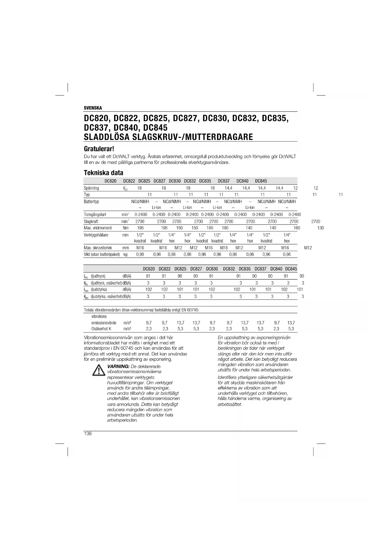 Gratulerar! Du har valt ett DEWALT verktyg. Åratals erfarenhet, omsorgsfull produktutveckling och förnyelse gör DEWALT till en av de mest pålitliga partnerna för professionella elverktygsanvändare. Tekniska data DC820 DC822 DC825 DC827 DC830 DC832 DC835 DC837 DC840 DC845 Spänning V