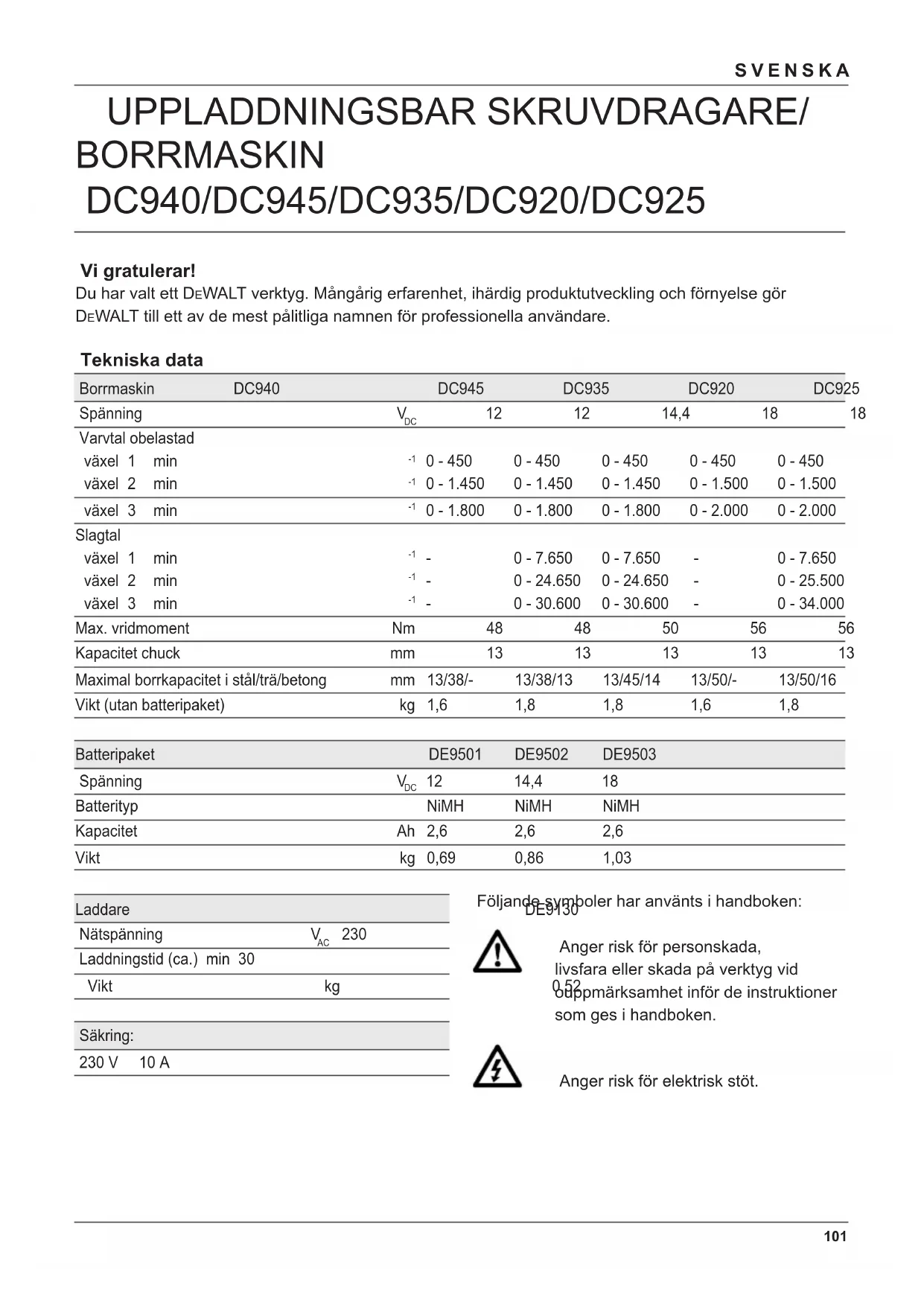 Vi gratulerar! Du har valt ett D E WALT verktyg. Mångårig erfarenhet, ihärdig produktutveckling och förnyelse gör D E WALT till ett av de mest pålitliga namnen för professionella användare. Tekniska data Borrmaskin DC940 DC945 DC935 DC920 DC925 Spänning V 12 12 14,4 18 18 Varvtal obelastad växel 1 min