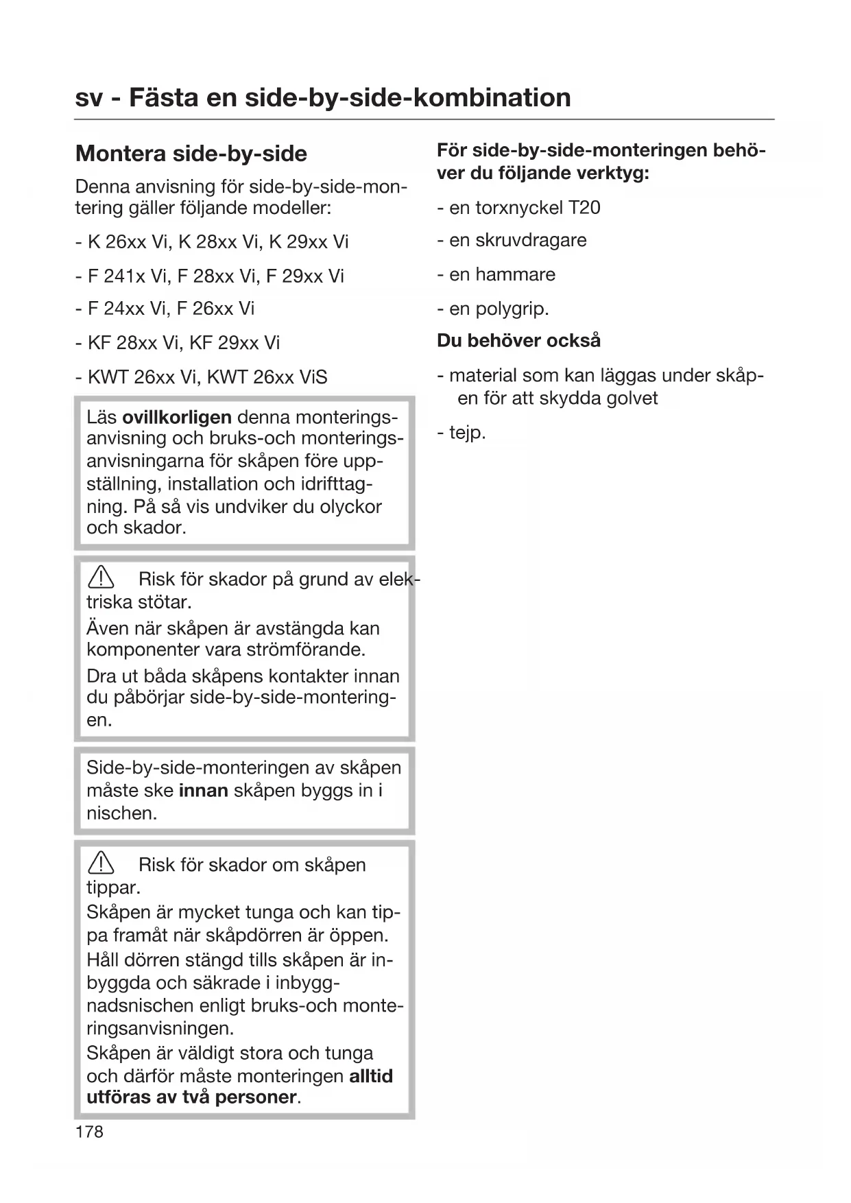 Montera side-by-side Denna anvisning för side-by-side-mon- tering gäller följande modeller: - K 26xx Vi, K 28xx Vi, K 29xx Vi - F 241x Vi, F 28xx Vi, F 29xx Vi - F 24xx Vi, F 26xx Vi - KF 28xx Vi, KF 29xx Vi - KWT 26xx Vi, KWT 26xx ViS Läs ovillkorligen denna monterings- anvisning och bruks-och monterings- anvisningarna för skåpen före upp- ställning, installation och idrifttag- ning. På så vis undviker du olyckor och skador. Risk för skador på grund av elek- triska stötar. Även när skåpen är avstängda kan komponenter vara strömförande. Dra ut båda skåpens kontakter innan du påbörjar side-by-side-montering- en. Side-by-side-monteringen av skåpen måste ske innan skåpen byggs in i nischen. Risk för skador om skåpen tippar. Skåpen är mycket tunga och kan tip- pa framåt när skåpdörren är öppen. Håll dörren stängd tills skåpen är in- byggda och säkrade i inbygg- nadsnischen enligt bruks-och monte- ringsanvisningen. Skåpen är väldigt stora och tunga och därför måste monteringen alltid utföras av två personer. För side-by-side-monteringen behö- ver du följande verktyg: - en torxnyckel T20 - en skruvdragare - en hammare - en polygrip. Du behöver också - material som kan läggas under skåp- en för att skydda golvet - tejp.sv - Fästa en side-by-side-kombination