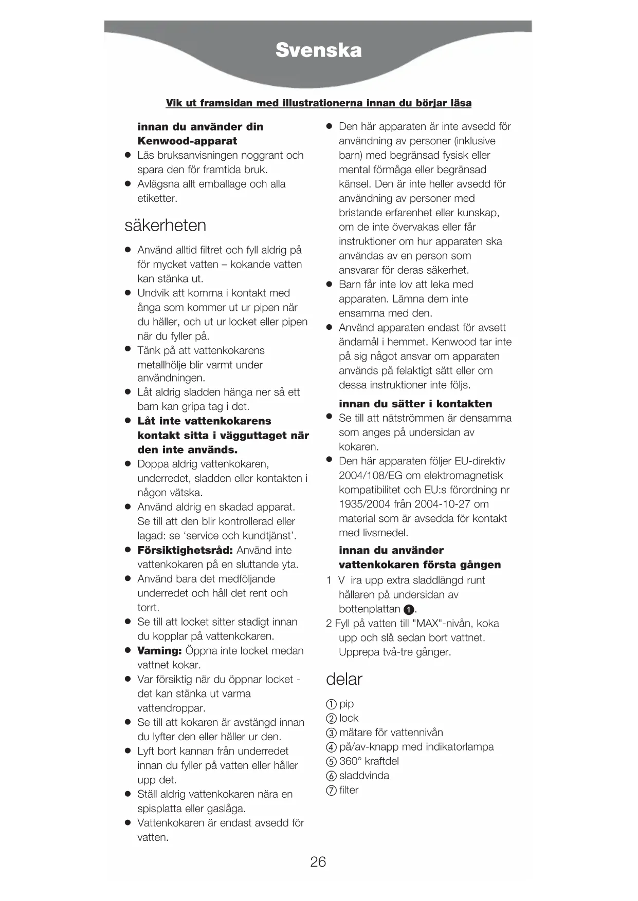 Den här apparaten följer EU-direktiv 2004/108/EG om elektromagnetisk kompatibilitet och EU:s förordning nr 1935/2004 från 2004-10-27 om material som är avsedda för kontakt med livsmedel. innan du använder vattenkokaren första gången 1Vira upp extra sladdlängd runt hållaren på undersidan av bottenplattan . 2 Fyll på vatten till "MAX"-nivån, koka upp och slå sedan bort vattnet. Upprepa två-tre gånger. delar pip lock mätare för vattennivån på/av-knapp med indikatorlampa 360° kraftdel sladdvinda filter Svenska