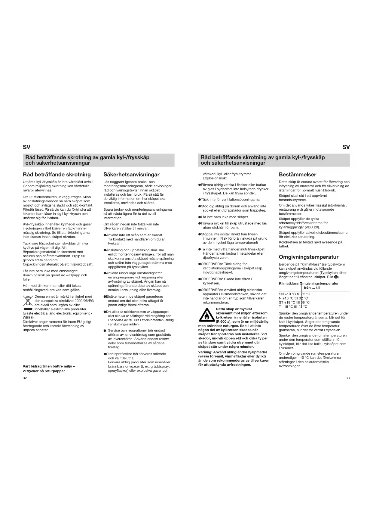 Klimatklass Omgivningstemperatur från … till SN +10 °C till 32 °C N +16 °C till 32 °C ST +18 °C till 38 °C T +18 °C till 43 °C Sjunker den omgivande temperaturen under de nedre temperaturgränserna, blir det för kallt i kylskåpet. Stiger den omgivande temperaturen över de övre temperatur- gränserna, blir det för varmt i frysdelen. Sjunker den omgivande rumstemperaturen under den temperatur som ställts in för kylskåpet, blir det lika kallt i kylskåpet som i rummet. Om den omgivande rumstemperaturen understiger +10 °C kan det förekomma störningar i den helautomatiska avfrostningen. Råd beträffande skrotning av gamla kyl-/frysskåp och säkerhetsanvisningar