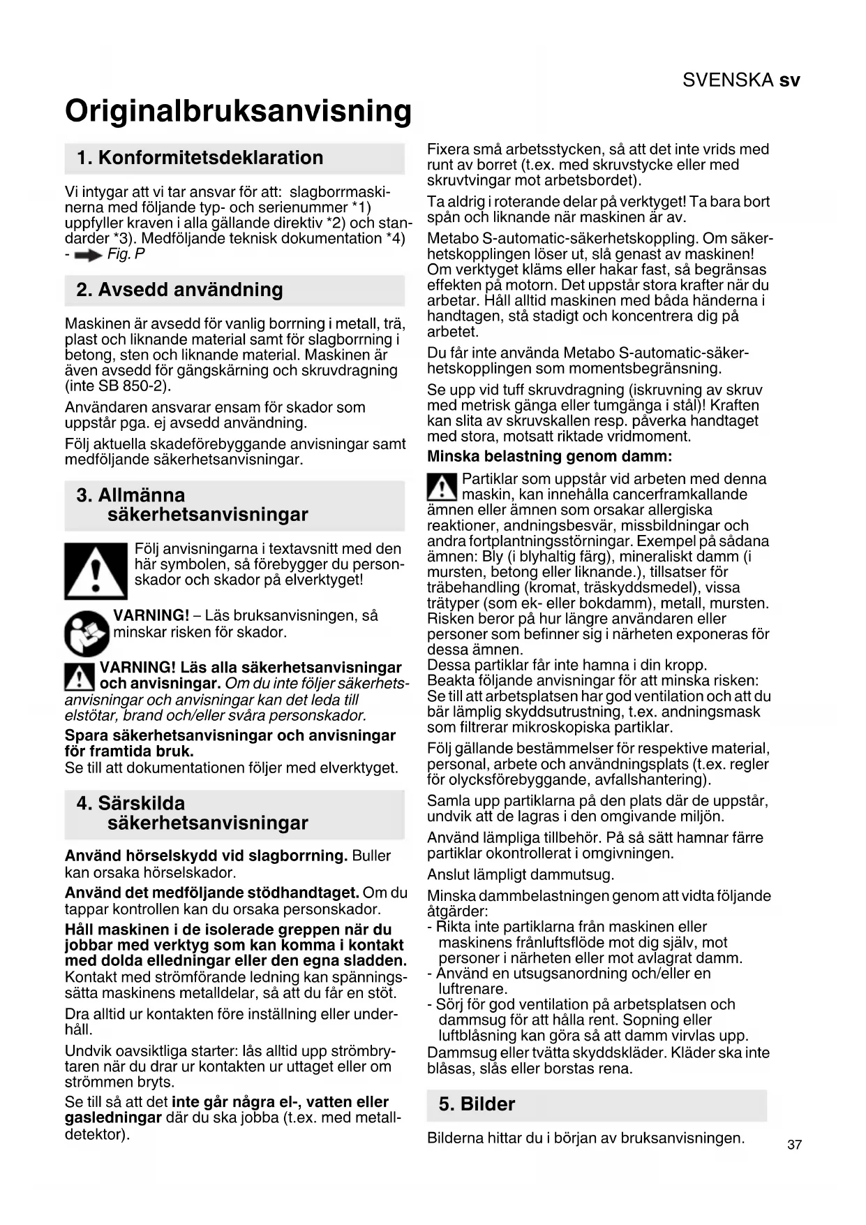 Maskinen är avsedd för vanlig borrning i metall, trä, plast och liknande material samt för slagborrning i betong, sten och liknande material. Maskinen är även avsedd för gängskärning och skruvdragning (inte SB 850-2). Användaren ansvarar ensam för skador som uppstår pga. ej avsedd användning. Följ aktuella skadeförebyggande anvisningar samt medföljande säkerhetsanvisningar. Följ anvisningarna i textavsnitt med den här symbolen, så förebygger du person- skador och skador på elverktyget! VARNING! – Läs bruksanvisningen, så minskar risken för skador. VARNING! Läs alla säkerhetsanvisningar och anvisningar. Om du inte följer säkerhets- anvisningar och anvisningar kan det leda till elstötar, brand och/eller svåra personskador. Spara säkerhetsanvisningar och anvisningar för framtida bruk. Se till att dokumentationen följer med elverktyget. Använd hörselskydd vid slagborrning. Buller kan orsaka hörselskador. Använd det medföljande stödhandtaget. Om du tappar kontrollen kan du orsaka personskador. Håll maskinen i de isolerade greppen när du jobbar med verktyg som kan komma i kontakt med dolda elledningar eller den egna sladden. Kontakt med strömförande ledning kan spännings- sätta maskinens metalldelar, så att du får en stöt. Dra alltid ur kontakten före inställning eller under- håll. Undvik oavsiktliga starter: lås alltid upp strömbry- taren när du drar ur kontakten ur uttaget eller om strömmen bryts. Se till så att det inte går några el-, vatten eller gasledningar där du ska jobba (t.ex. med metall- detektor). Fixera små arbetsstycken, så att det inte vrids med runt av borret (t.ex. med skruvstycke eller med skruvtvingar mot arbetsbordet). Ta aldrig i roterande delar på verktyget! Ta bara bort spån och liknande när maskinen är av. Metabo S-automatic-säkerhetskoppling. Om säker- hetskopplingen löser ut, slå genast av maskinen! Om verktyget kläms eller hakar fast, så begränsas effekten på motorn. Det uppstår stora krafter när du arbetar. Håll alltid maskinen med båda händerna i handtagen, stå stadigt och koncentrera dig på arbetet. Du får inte använda Metabo S-automatic-säker- hetskopplingen som momentsbegränsning. Se upp vid tuff skruvdragning (iskruvning av skruv med metrisk gänga eller tumgänga i stål)! Kraften kan slita av skruvskallen resp. påverka handtaget med stora, motsatt riktade vridmoment. Minska belastning genom damm: Partiklar som uppstår vid arbeten med denna maskin, kan innehålla cancerframkallande ämnen eller ämnen som orsakar allergiska reaktioner, andningsbesvär, missbildningar och andra fortplantningsstörningar. Exempel på sådana ämnen: Bly (i blyhaltig färg), mineraliskt damm (i mursten, betong eller liknande.), tillsatser för träbehandling (kromat, träskyddsmedel), vissa trätyper (som ek- eller bokdamm), metall, mursten. Risken beror på hur längre användaren eller personer som befinner sig i närheten exponeras för dessa ämnen. Dessa partiklar får inte hamna i din kropp. Beakta följande anvisningar för att minska risken: Se till att arbetsplatsen har god ventilation och att du bär lämplig skyddsutrustning, t.ex. andningsmask som filtrerar mikroskopiska partiklar. Följ gällande bestämmelser för respektive material, personal, arbete och användningsplats (t.ex. regler för olycksförebyggande, avfallshantering). Samla upp partiklarna på den plats där de uppstår, undvik att de lagras i den omgivande miljön. Använd lämpliga tillbehör. På så sätt hamnar färre partiklar okontrollerat i omgivningen. Anslut lämpligt dammutsug. Minska dammbelastningen genom att vidta följande åtgärder: - Rikta inte partiklarna från maskinen eller maskinens frånluftsflöde mot dig själv, mot personer i närheten eller mot avlagrat damm. - Använd en utsugsanordning och/eller en luftrenare. - Sörj för god ventilation på arbetsplatsen och dammsug för att hålla rent. Sopning eller luftblåsning kan göra så att damm virvlas upp. Dammsug eller tvätta skyddskläder. Kläder ska inte blåsas, slås eller borstas rena. Bilderna hittar du i början av bruksanvisningen.