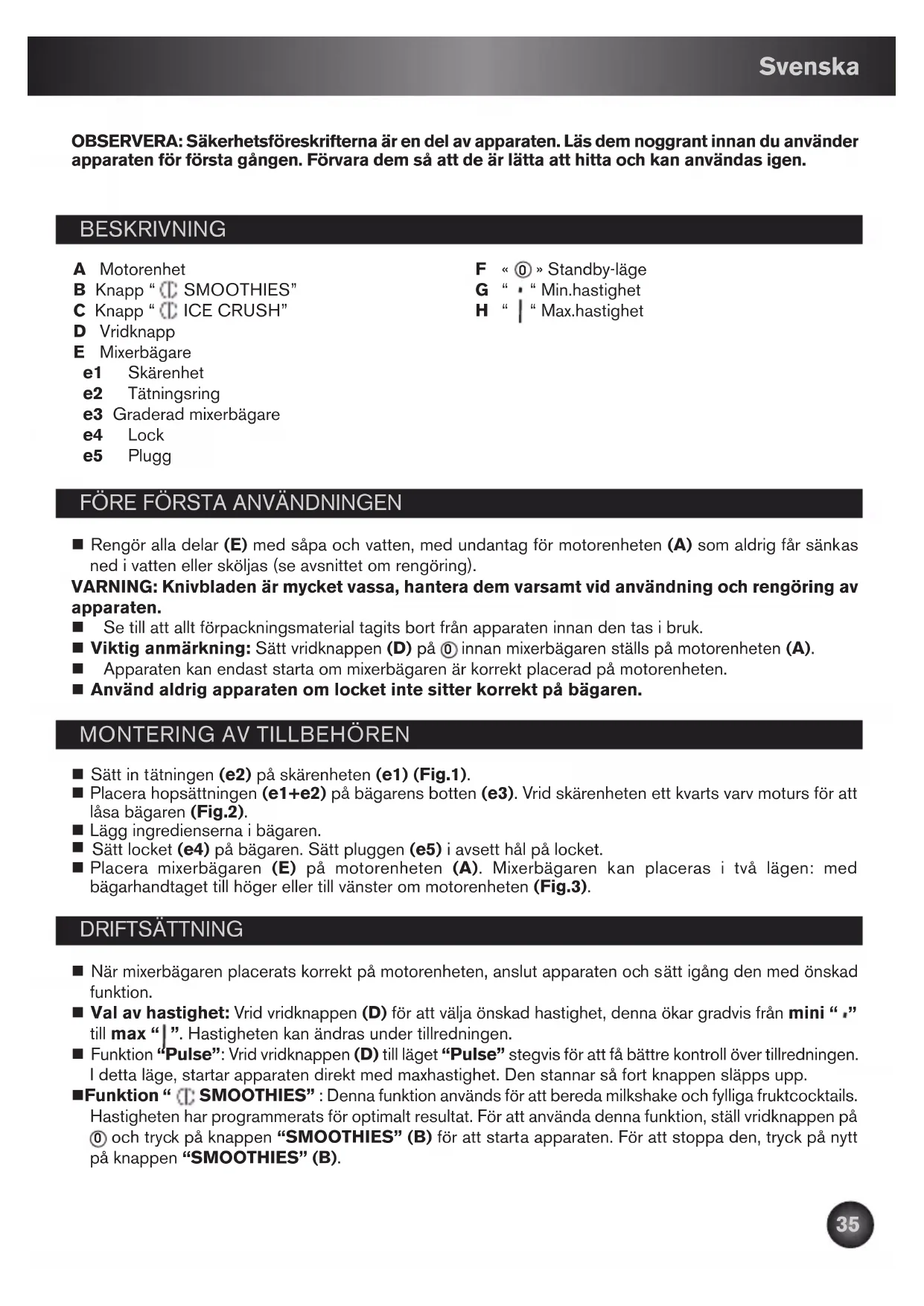 och tryck på knappen “SMOOTHIES” (B) för att starta apparaten. För att stoppa den, tryck på nytt på knappen “SMOOTHIES” (B). OBSERVERA: Säkerhetsföreskrifterna är en del av apparaten. Läs dem noggrant innan du använder apparaten för första gången. Förvara dem så att de är lätta att hitta och kan användas igen.36 SvenskaSvenska n Funktion “ ICE CRUSH” Denna funktion används för att finkrossa is tack vare en förprogrammerad funktionssekvens och hastighet. För att använda denna funktion, ställ vridknappen på