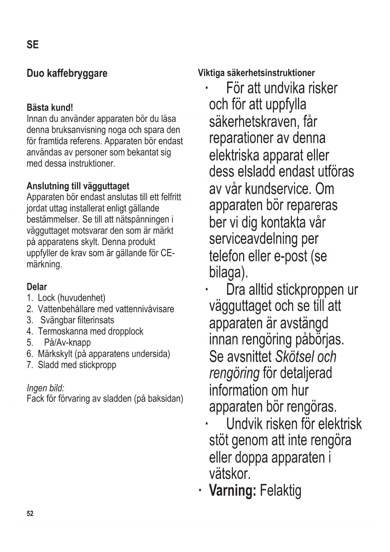användning kan orsaka svåra personskador. ∙ Varning: Kokarens ytor blir mycket het under användningen och förblir heta en tid efteråt. ∙ Apparaten bör inte användas inuti ett stängt skåp. ∙ Apparaten är avsedd för hemmabruk eller liknande användning, såsom - i personalkök, kontor och andra kommersiella miljöer, - i företag inom jordbrukssektorn, - för gäster i hotell, motell och liknande inkvarteringsställen, - för gäster i bed-and- breakfast hus. ∙ Denna apparat kan användas av barn (minst 8 år gamla) och av personer som har minskad fysisk rörelseförmåga, reducerat sinnes- eller mentaltillstånd, eller som har bristfällig erfarenhet och kunskap, förutsatt att dessa personer är under uppsyn eller har fått tillräckliga instruktioner beträffande apparatens användning och vet vilka risker och säkerhetsåtgärder som användningen innefattar. ∙ Barn bör inte tillåtas rengöra eller göra service på apparaten ifall de inte är övervakade och minst 8 år gamla. ∙ Apparaten och dess elsladd bör hållas utom räckhåll för barn under 8 år. ∙ Barn bör inte tillåtas leka med apparaten. ∙ Varning: Håll barn på avstånd från apparatens förpackningsmaterial eftersom fara eventuellt kan uppstå. Det nnst.ex.riskförkvävning. ∙ Stäng alltid kannan med dess dropplock. Lämna inte termoskannan utan uppsyn i54 104 x 142 mm närheten av barn. ∙ Innan varje användning bör apparaten samt dess elsladd och monterade tillbehör inspekteras noga så att de inte har några skador. Om apparaten t ex har tappats på en hård yta, eller om elsladden har utsatts för alltför hård kraft, bör den inte längre användas: Även osynliga skador kan försämra apparatens driftsäkerhet. ∙ Under användningen bör apparaten placeras på ett plan och stadig yta som är vattentålig. ∙ Placera apparaten samt elsladden så att dessa inte kommer i närheten av hett underlag eller nära heta källor såsom öppen eld. ∙ Låt inte elsladden hänga fritt; sladden måste hållas på säkert avstånd från apparatens heta delar. ∙ Dra alltid stickproppen ur vägguttaget - ifall apparaten skulle krångla, - efter användning, samt - innan apparaten rengörs. ∙ Ta stickproppen ur vägguttaget genom att dra i stickproppen, aldrig i sladden. ∙ Rör inte stickproppen med våta händer. ∙ Stäng av apparaten och låt den svalna av innan du öppnar locket eller tar bort tillbehör. Hett vatten eller het ånga kan orsaka brännskador. ∙ Lämna inte apparaten utan tillsyn när den är påslagen. ∙ Inget ansvar godtas om skada uppkommer till följd av felaktig användning, eller om dessa instruktioner inte följts. Fack för förvaring av sladden Detnnsettkabelförvaringsutrymme i bakre delen av apparaten. Dra ut sladden till lämplig längd innan du startar apparaten. Automatisk avstängning För att spara energi kommer de modeller av kaffekokare som har termoskanna att stängas av automatiskt efter det att bryggningen är klar. Innan första användningen Innan apparaten används första gången bör du rengöra den noggrant genom att brygga 2-3 gånger med maximal mängd kallt vatten utan malet kaffe. Följ denna procedur separat för båda sidorna. Detta gäller även när apparaten inte varit i bruk under en längre period. Allmän information ∙ Den dubbla måttskalan på varje vattenbehållare visar hur mycket vatten som går åt för det antal koppar kaffe du önskar brygga. Den vänstra skalan visar medelstora koppar på ca 125 ml, medan den högra skalan visar mindre koppar. Överskrid inte det indikerade märket för maximal mängd vatten. ∙ Omduvillgöraera bryggningsomgångar efter varandra bör du alltid stänga av kaffebryggaren och låt den svalna i ca 5 minuter innan återanvändning. ∙ Varning: Fyll inte vattenbehållaren med vatten omedelbart efter bryggningen. Om hett vatten eller het ånga avges föreligger risk för skållning.104 x 142 mm