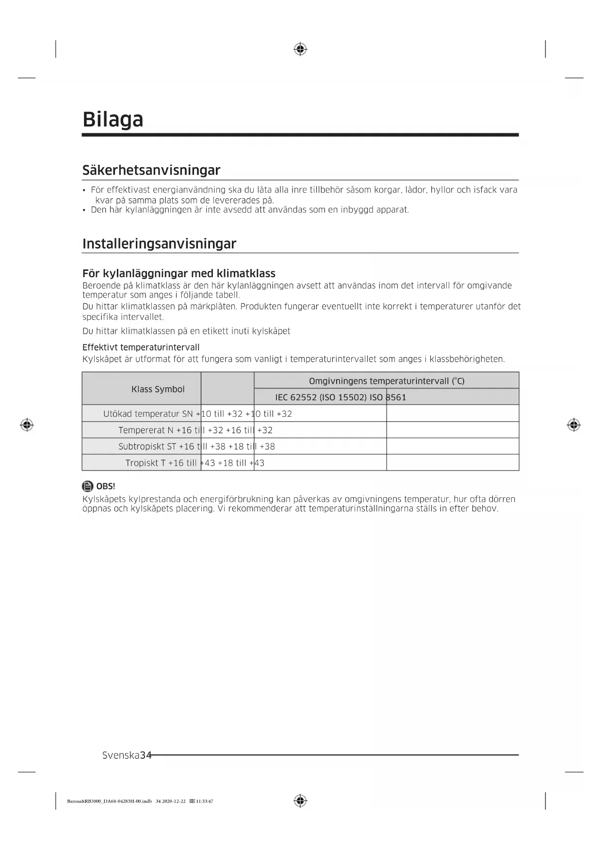 Utökad temperatur SN +10 till +32 +10 till +32 Tempererat N +16 till +32 +16 till +32 Subtropiskt ST +16 till +38 +18 till +38 Tropiskt T +16 till +43 +18 till +43 OBS! Kylskåpets kylprestanda och energiförbrukning kan påverkas av omgivningens temperatur, hur ofta dörren öppnas och kylskåpets placering. Vi rekommenderar att temperaturinställningarna ställs in efter behov. Barosa&RB3000_DA68-04283H-00.indb 34 2020-12-22 11:33:47Svenska 35 Temperaturanvisningar Rekommenderad temperatur Optimal temperatur för lagring av livsmedel: