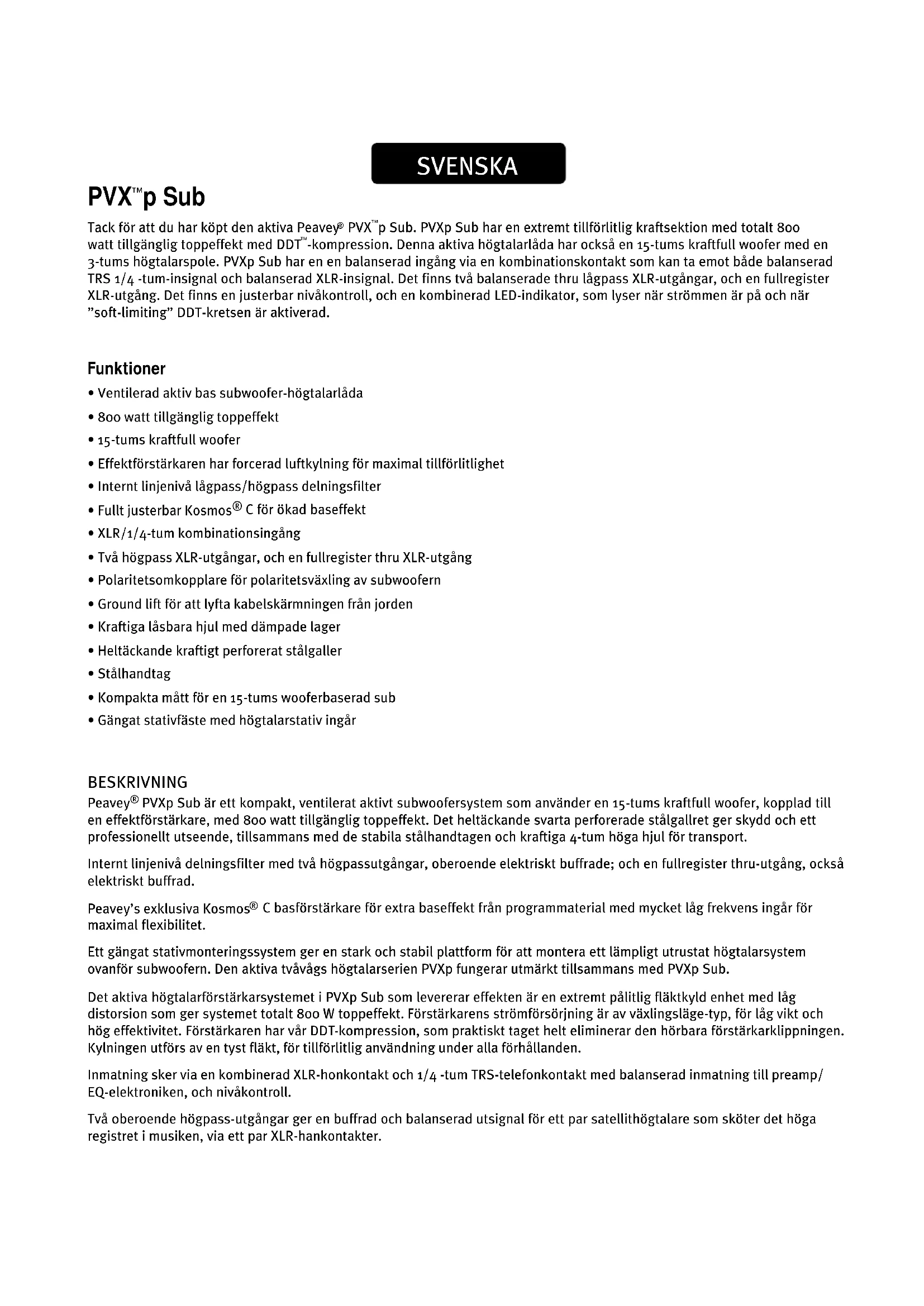 PVXp Sub är ett kompakt, ventilerat aktivt subwoofersystem som använder en 15-tums kraftfull woofer, kopplad till en effektförstärkare, med 800 watt tillgänglig toppeffekt. Det heltäckande svarta perforerade stålgallret ger skydd och ett professionellt utseende, tillsammans med de stabila stålhandtagen och kraftiga 4-tum höga hjul för transport. Internt linjenivå delningsfilter med två högpassutgångar, oberoende elektriskt buffrade; och en fullregister thru-utgång, också elektriskt buffrad. Peavey’s exklusiva Kosmos