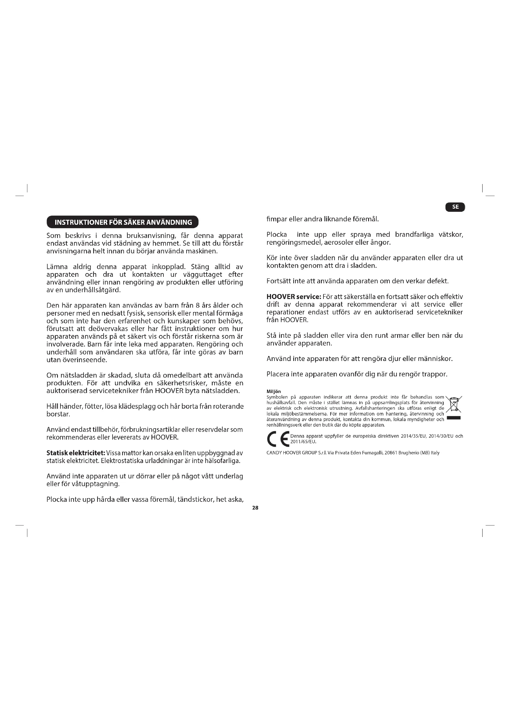 INSTRUKTIONER FÖR SÄKER ANVÄNDNING Som beskrivs i denna bruksanvisning, får denna apparat endast användas vid städning av hemmet. Se till att du förstår anvisningarna helt innan du börjar använda maskinen. Lämna aldrig denna apparat inkopplad. Stäng alltid av apparaten och dra ut kontakten ur vägguttaget efter användning eller innan rengöring av produkten eller utföring av en underhållsåtgärd. Den här apparaten kan användas av barn från 8 års ålder och personer med en nedsatt fysisk, sensorisk eller mental förmåga och som inte har den erfarenhet och kunskaper som behövs, förutsatt att deövervakas eller har fått instruktioner om hur apparaten används på et säkert vis och förstår riskerna som är involverade. Barn får inte leka med apparaten. Rengöring och underhåll som användaren ska utföra, får inte göras av barn utan överinseende. Om nätsladden är skadad, sluta då omedelbart att använda produkten. För att undvika en säkerhetsrisker, måste en auktoriserad servicetekniker från HOOVER byta nätsladden. Håll händer, fötter, lösa klädesplagg och hår borta från roterande borstar. Använd endast tillbehör, förbrukningsartiklar eller reservdelar som rekommenderas eller levererats av HOOVER. Statisk elektricitet: Vissa mattor kan orsaka en liten uppbyggnad av statisk elektricitet. Elektrostatiska urladdningar är inte hälsofarliga. Använd inte apparaten ut ur dörrar eller på något vått underlag eller för våtupptagning. Plocka inte upp hårda eller vassa föremål, tändstickor, het aska, mpar eller andra liknande föremål. Plocka inte upp eller spraya med brandfarliga vätskor, rengöringsmedel, aerosoler eller ångor. Kör inte över sladden när du använder apparaten eller dra ut kontakten genom att dra i sladden. Fortsätt inte att använda apparaten om den verkar defekt. HOOVER service: För att säkerställa en fortsatt säker och eektiv drift av denna apparat rekommenderar vi att service eller reparationer endast utförs av en auktoriserad servicetekniker från HOOVER. Stå inte på sladden eller vira den runt armar eller ben när du använder apparaten. Använd inte apparaten för att rengöra djur eller människor. Placera inte apparaten ovanför dig när du rengör trappor. Miljön Symbolen på apparaten indikerar att denna produkt inte får behandlas som hushållsavfall. Den måste i stället lämnas in på uppsamlingsplats för återvinning av elektrisk och elektronisk utrustning. Avfallshanteringen ska utföras enligt de lokala miljöbestämmelserna. För mer information om hantering, återvinning och återanvändning av denna produkt, kontakta din kommun, lokala myndigheter och renhållningsverk eller den butik där du köpte apparaten. Denna apparat uppfyller de europeiska direktiven 2014/35/EU, 2014/30/EU och 2011/65/EU. CANDY HOOVER GROUP S.r.l. Via Privata Eden Fumagalli, 20861 Brugherio (MB) Italy29