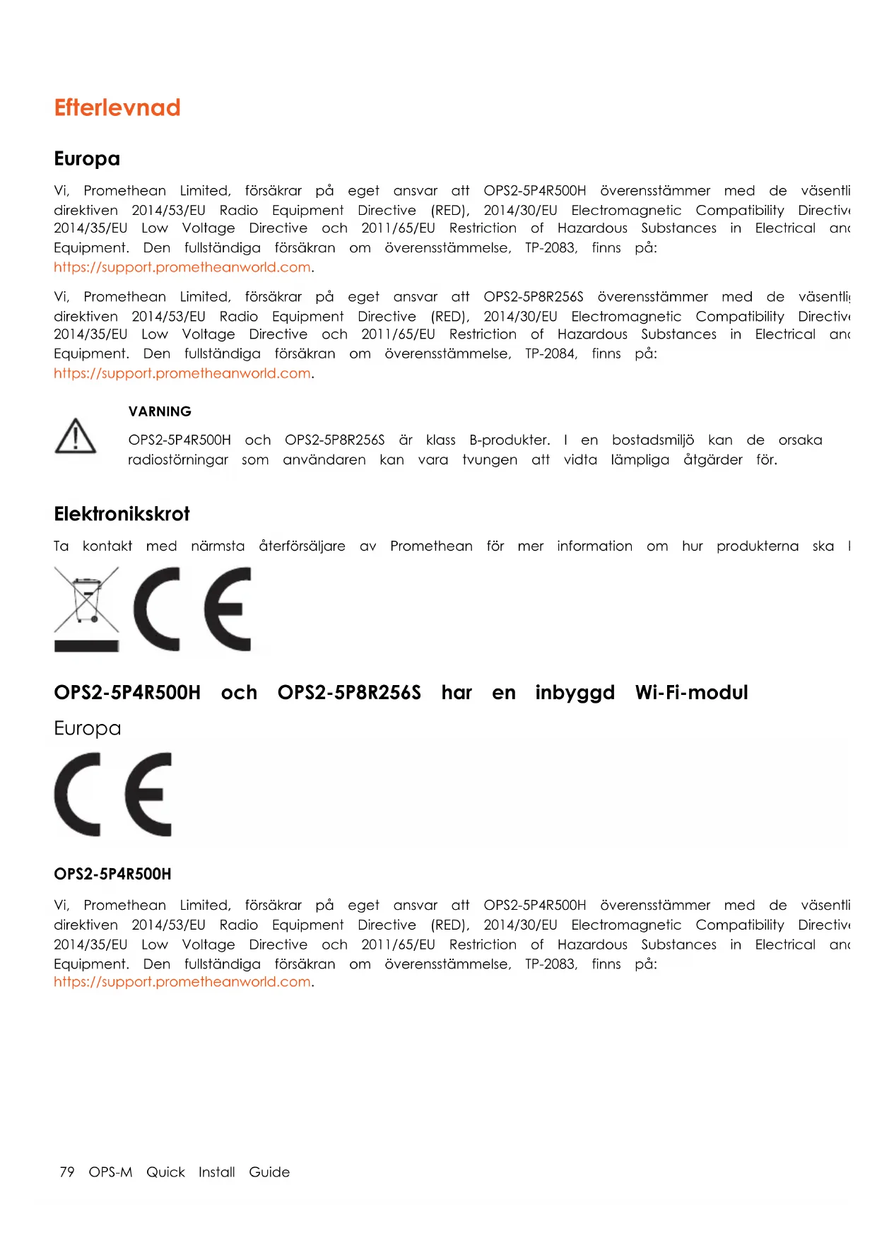 Vi, Promethean Limited, försäkrar på eget ansvar att OPS2-5P4R500H överensstämmer med de väsentliga kraven i EU- direktiven 2014/53/EU Radio Equipment Directive (RED), 2014/30/EU Electromagnetic Compatibility Directive, 2014/35/EU Low Voltage Directive och 2011/65/EU Restriction of Hazardous Substances in Electrical and Electronic Equipment. Den fullständiga försäkran om överensstämmelse, TP-2083, finns på: https://support.prometheanworld.com. 79 OPS-M Quick Install GuideTyp Frekvens (MHz) Maximal energi (dBm) BT 2400-2483.4 10 Wifi 2400-2483.4 20 Wifi 5150-5725 20 Wifi 5725-5825 14