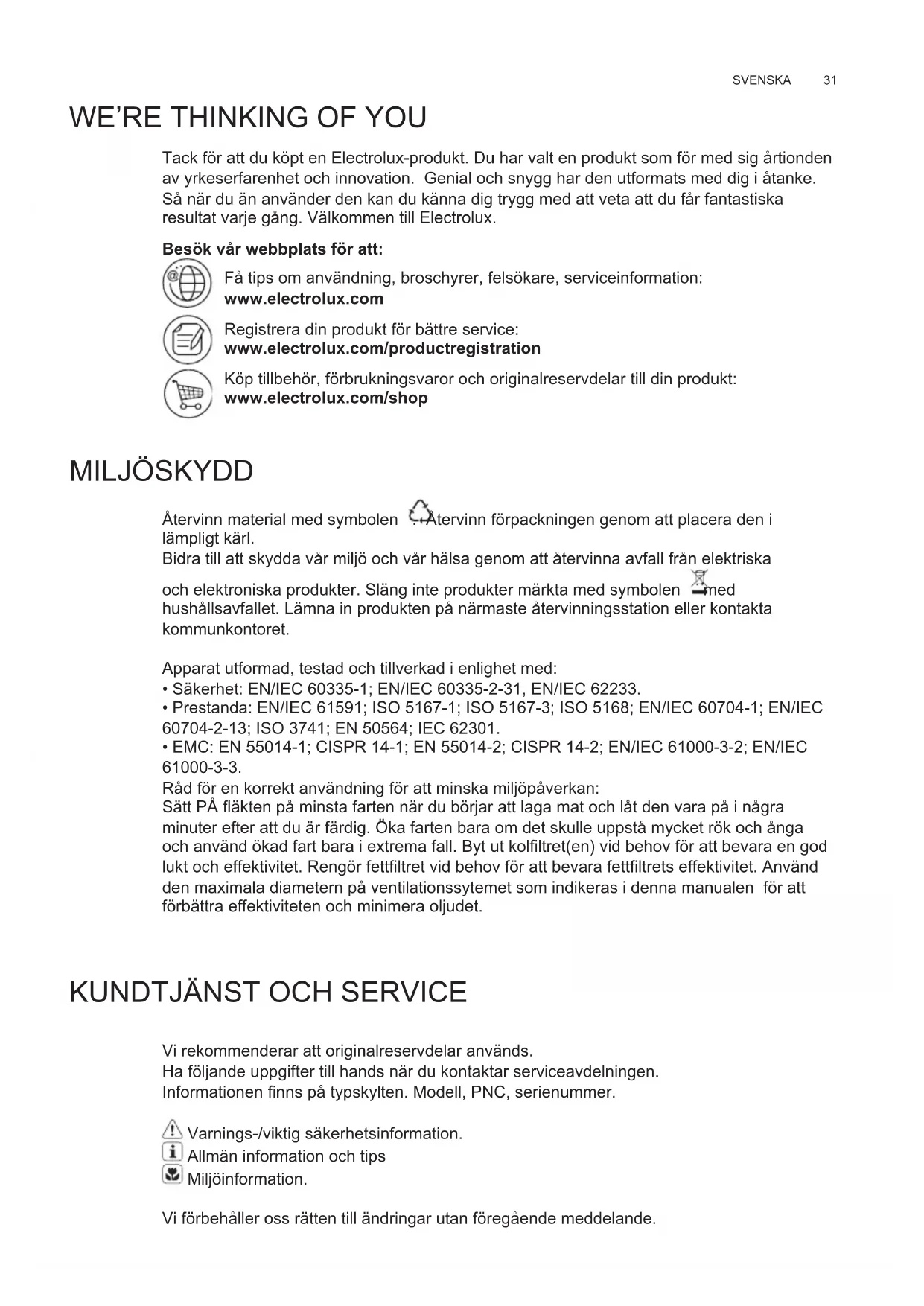 Vi rekommenderar att originalreservdelar används. Ha följande uppgifter till hands när du kontaktar serviceavdelningen. Informationen finns på typskylten. Modell, PNC, serienummer. Varnings-/viktig säkerhetsinformation. Allmän information och tips Miljöinformation. Vi förbehåller oss rätten till ändringar utan föregående meddelande.