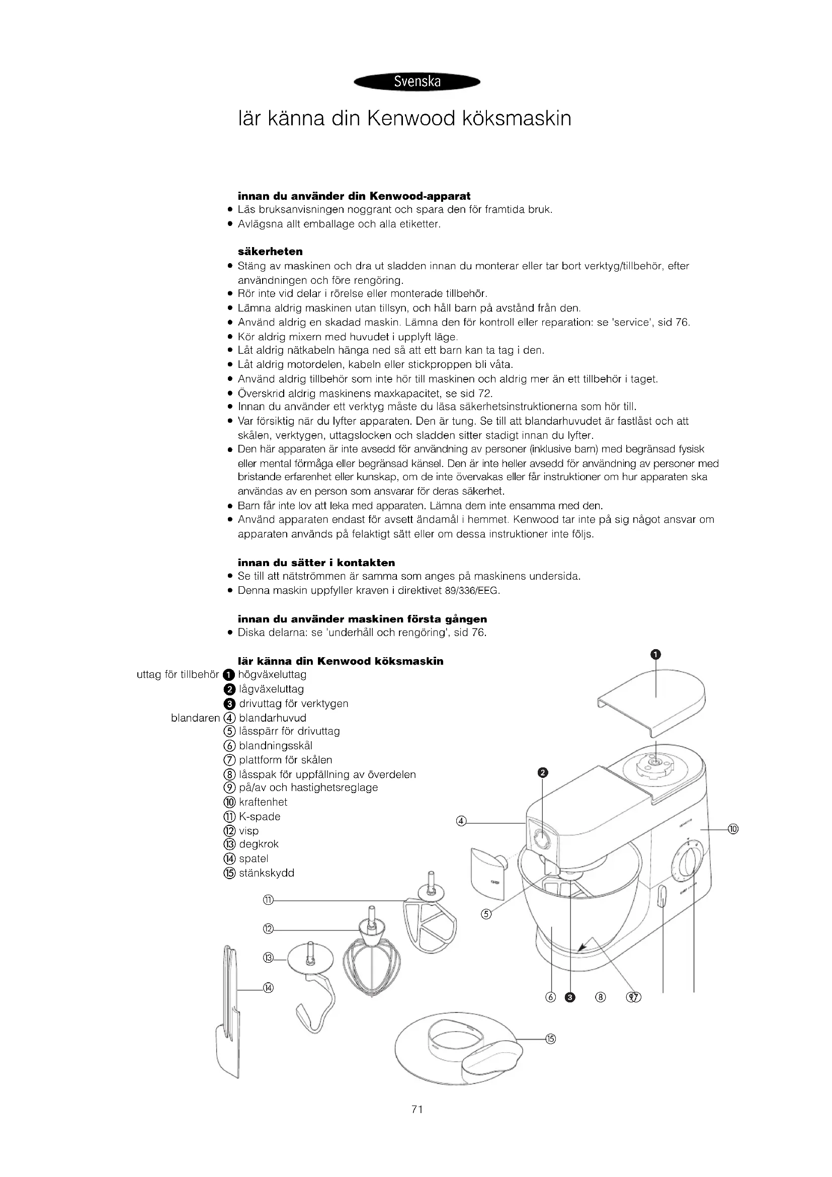 Diska delarna: se 'underhåll och rengöring', sid 76. lär känna din Kenwood köksmaskin uttag för tillbehör högväxeluttag lågväxeluttag drivuttag för verktygen blandaren blandarhuvud låsspärr för drivuttag blandningsskål plattform för skålen låsspak för uppfällning av överdelen på/av och hastighetsreglage kraftenhet K-spade visp degkrok spatel stänkskydd lär känna din Kenwood köksmaskin