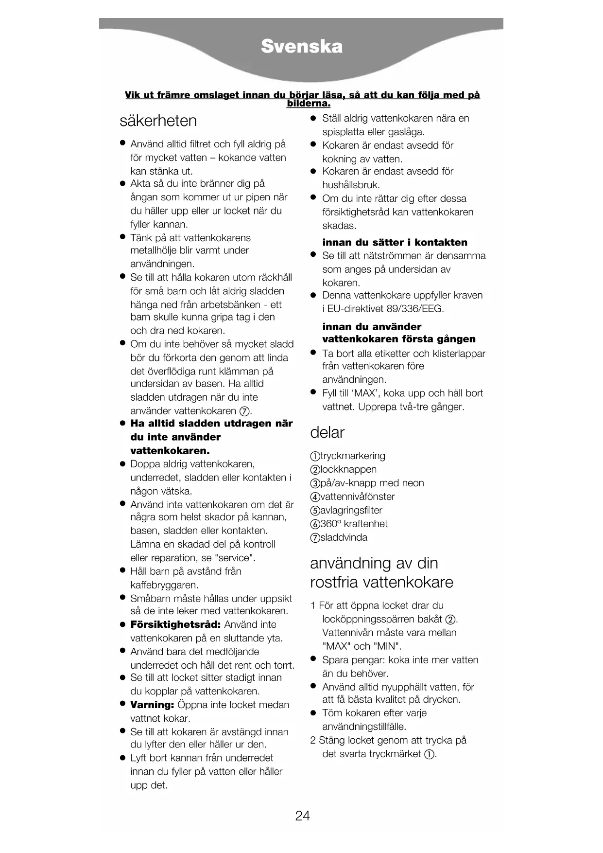 Svenska Vik ut främre omslaget innan du börjar läsa, så att du kan följa med på bilderna.3 Sätt i kontakten och koppla på. Då tänds neonlampan. 4 Kokaren kokar upp och slås av automatiskt. Om du vill koka på nytt skall du vänta några sekunden – on/off-strömbrytaren behöver lite tid för att återställas.