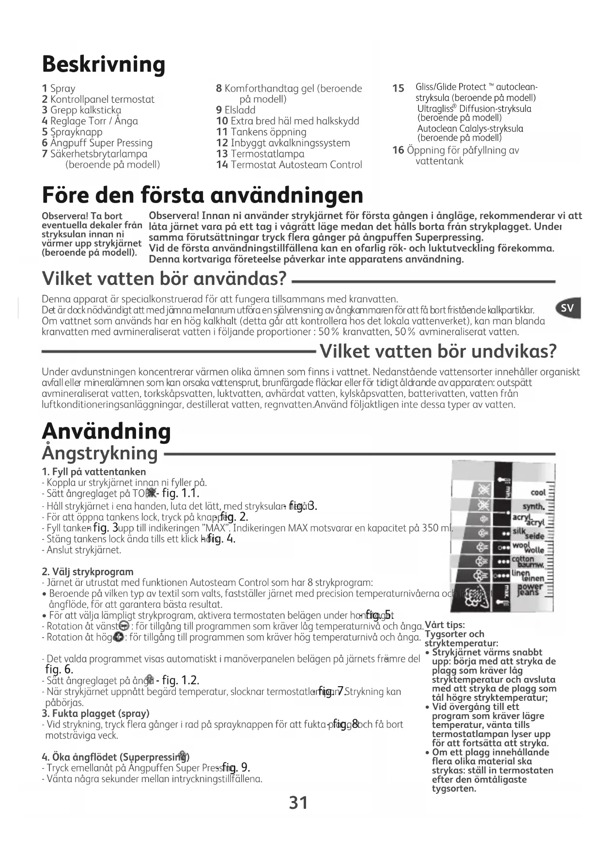 - fig. 1.1. - Håll strykjärnet i ena handen, luta det lätt, med stryksulan neråt - fig. 3. - För att öppna tankens lock, tryck på knappen - fig. 2. - Fyll tanken - fig. 3 upp till indikeringen ”MAX”. Indikeringen MAX motsvarar en kapacitet på 350 ml.- Stäng tankens lock ända tills ett klick hörs - fig. 4. - Anslut strykjärnet.2. Välj strykprogram- Järnet är utrustat med funktionen Autosteam Control som har 8 strykprogram:• Beroende på vilken typ av textil som valts, fastställer järnet med precision temperaturnivåerna och lämpligtångflöde, för att garantera bästa resultat.• För att välja lämpligt strykprogram, aktivera termostaten belägen under handtaget - fig. 5. - Rotation åt vänster : för tillgång till programmen som kräver låg temperaturnivå och ånga. - Rotation åt höger : för tillgång till programmen som kräver hög temperaturnivå och ånga.- Det valda programmet visas automatiskt i manöverpanelen belägen på järnets främre del