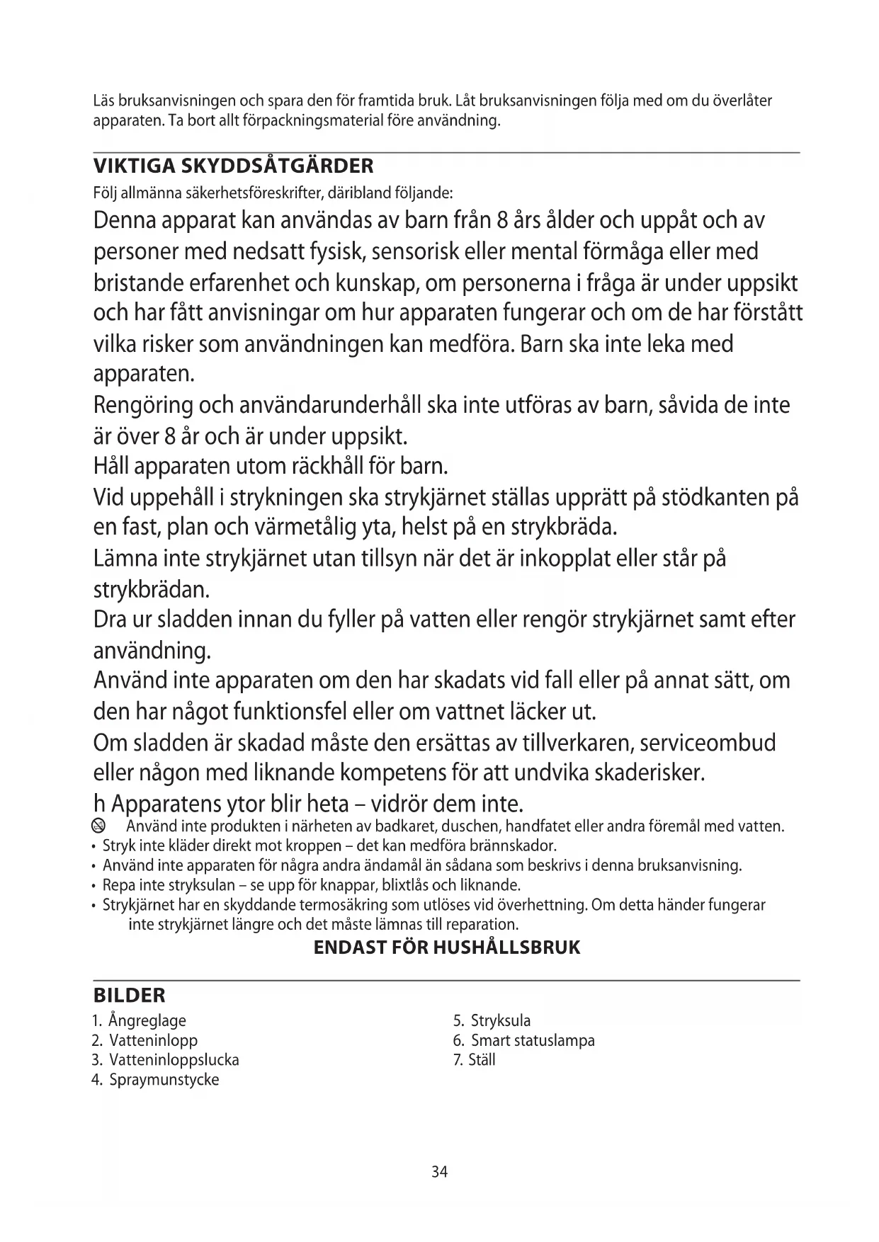 Följ allmänna säkerhetsföreskrifter, däribland följande: Denna apparat kan användas av barn från 8 års ålder och uppåt och av personer med nedsatt fysisk, sensorisk eller mental förmåga eller med bristande erfarenhet och kunskap, om personerna i fråga är under uppsikt och har fått anvisningar om hur apparaten fungerar och om de har förstått vilka risker som användningen kan medföra. Barn ska inte leka med apparaten. Rengöring och användarunderhåll ska inte utföras av barn, såvida de inte är över 8 år och är under uppsikt. Håll apparaten utom räckhåll för barn. Vid uppehåll i strykningen ska strykjärnet ställas upprätt på stödkanten på en fast, plan och värmetålig yta, helst på en strykbräda. Lämna inte strykjärnet utan tillsyn när det är inkopplat eller står på strykbrädan. Dra ur sladden innan du fyller på vatten eller rengör strykjärnet samt efter användning. Använd inte apparaten om den har skadats vid fall eller på annat sätt, om den har något funktionsfel eller om vattnet läcker ut. Om sladden är skadad måste den ersättas av tillverkaren, serviceombud eller någon med liknande kompetens för att undvika skaderisker. h Apparatens ytor blir heta – vidrör dem inte. b Använd inte produkten i närheten av badkaret, duschen, handfatet eller andra föremål med vatten.