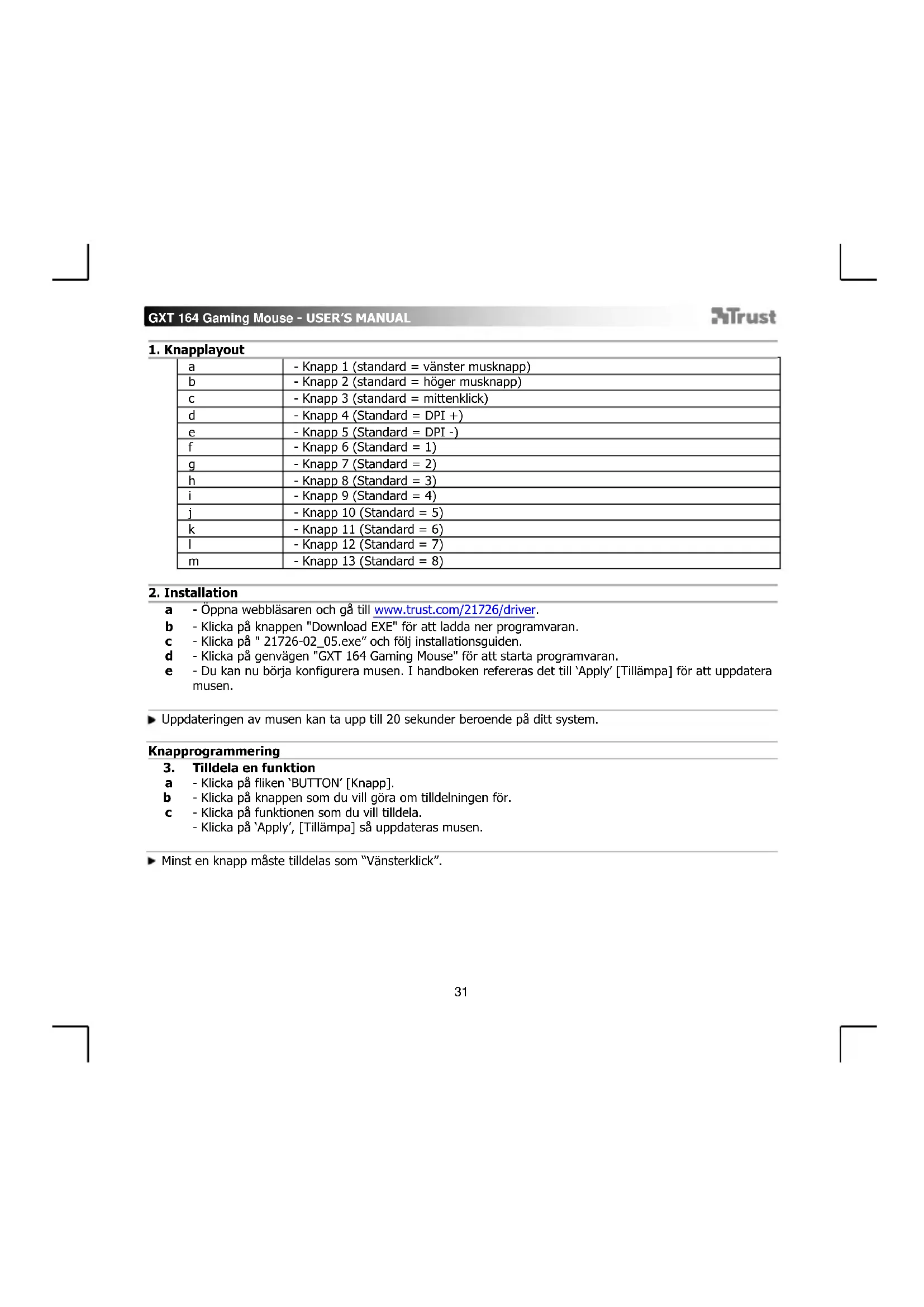 - Öppna webbläsaren och gå till www.trust.com/21726/driver. - Klicka på knappen "Download EXE" för att ladda ner programvaran. - Klicka på " 21726-02_05.exe” och följ installationsguiden. - Klicka på genvägen "GXT 164 Gaming Mouse" för att starta programvaran. - Du kan nu börja konfigurera musen. I handboken refereras det till ‘Apply’ [Tillämpa] för att uppdatera musen. Uppdateringen av musen kan ta upp till 20 sekunder beroende på ditt system. Knapprogrammering