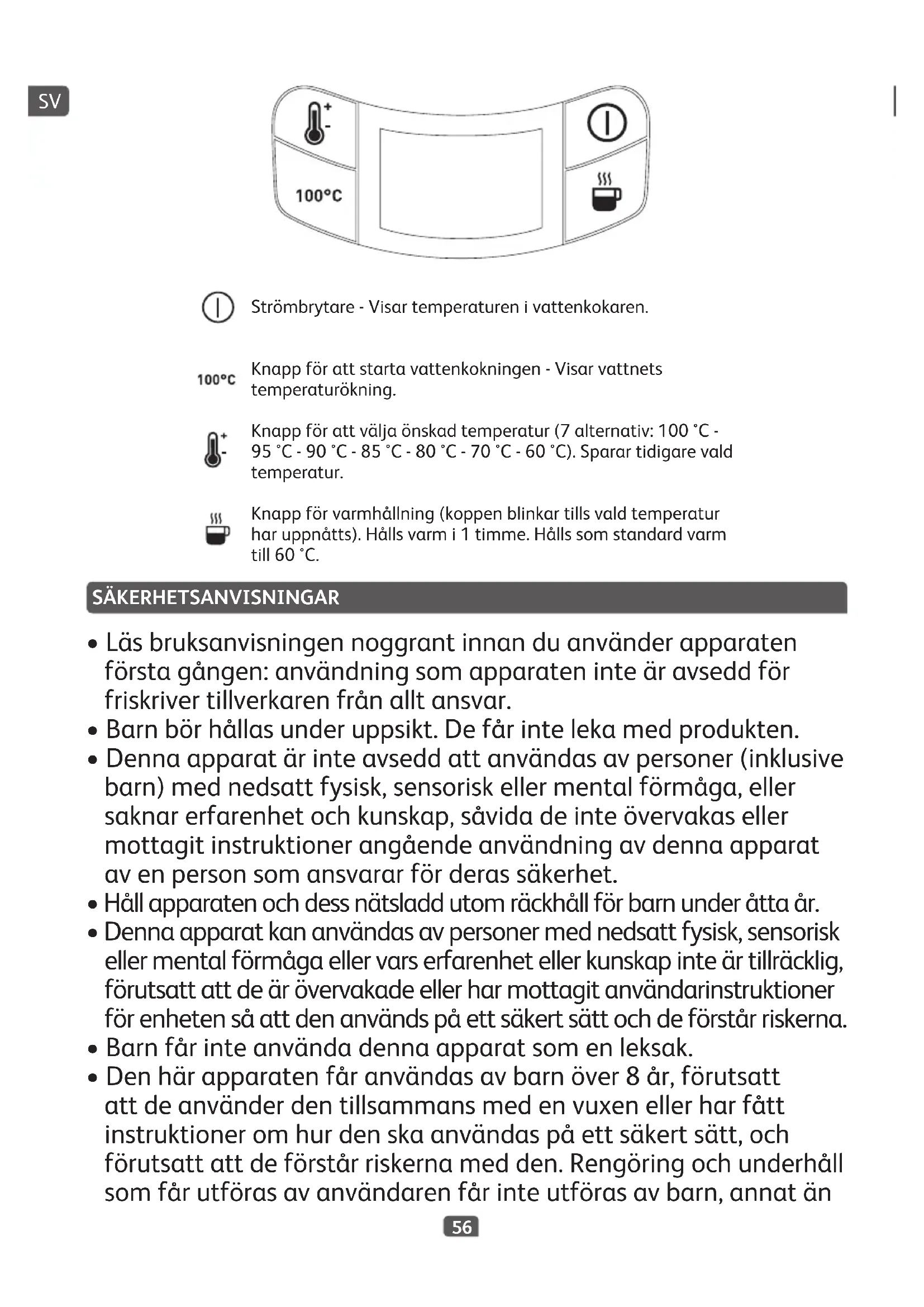 Strömbrytare-Visartemperaturenivattenkokaren. Knappförattstartavattenkokningen-Visarvattnets temperaturökning. Knappförattväljaönskadtemperatur(7alternativ:100°C- 95°C-90°C-85°C-80°C-70°C-60°C).Sparartidigarevald temperatur. Knappförvarmhållning(koppenblinkartillsvaldtemperatur haruppnåtts).Hållsvarmi1timme.Hållssomstandardvarm till60°C.57 omdeäröver8årochgördettillsammansmedenvuxen.