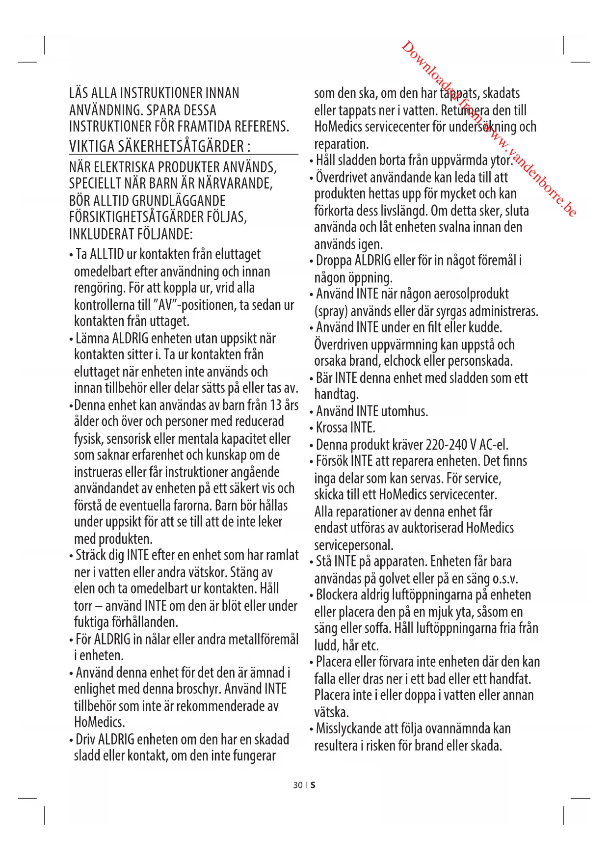 - Använd denna enhet för det den är ämnad i enlighet med denna broschyr. Använd INTE tillbehör som inte är rekommenderade av HoMedics.