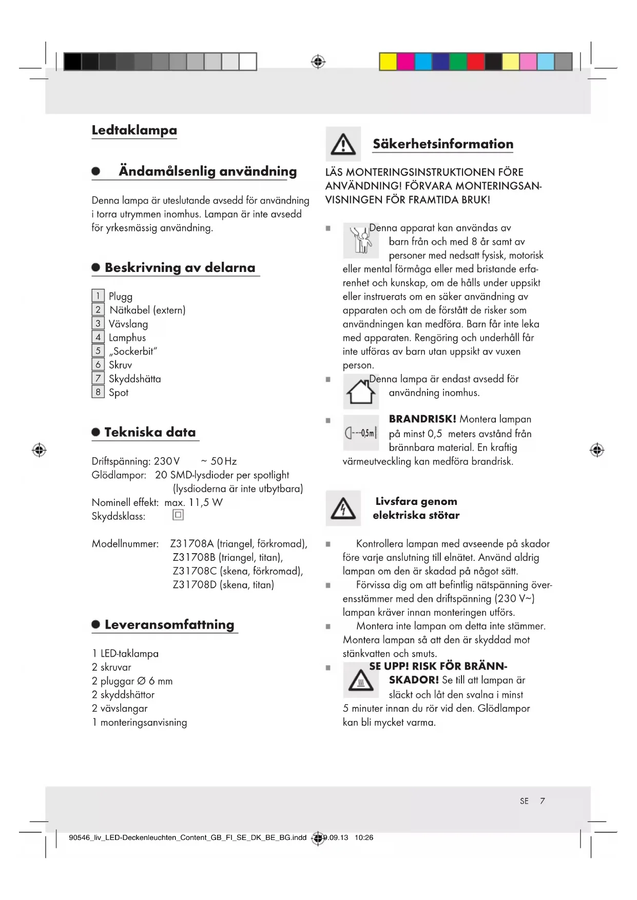 VISNINGEN FÖR FRAMTIDA BRUK! Denna apparat kan användas av barn från och med 8 år samt av personer med nedsatt fysisk, motorisk eller mental förmåga eller med bristande erfa- renhet och kunskap, om de hålls under uppsikt eller instruerats om en säker användning av apparaten och om de förstått de risker som användningen kan medföra. Barn får inte leka med apparaten. Rengöring och underhåll får inte utföras av barn utan uppsikt av vuxen person. Denna lampa är endast avsedd för användning inomhus. 0,5 m BRANDRISK! Montera lampan på minst 0,5 meters avstånd från brännbara material. En kraftig värmeutveckling kan medföra brandrisk. Livsfara genom elektriska stötar Kontrollera lampan med avseende på skador före varje anslutning till elnätet. Använd aldrig lampan om den är skadad på något sätt. Förvissa dig om att befintlig nätspänning över- ensstämmer med den driftspänning (230 V∼) lampan kräver innan monteringen utförs. Montera inte lampan om detta inte stämmer. Montera lampan så att den är skyddad mot stänkvatten och smuts. SE UPP! RISK FÖR BRÄNN- SKADOR! Se till att lampan är släckt och låt den svalna i minst 5 minuter innan du rör vid den. Glödlampor kan bli mycket varma. 90546_liv_LED-Deckenleuchten_Content_GB_FI_SE_DK_BE_BG.indd 7 19.09.13 10:268 SE Före montering Viktigt: Låt endast behörig elektriker utföra elinstallationer. Behörig elektriker har kunskaper om lampans egenskaper och anslutningsregler. Kontrollera att ledningen, som lampan ska in- stalleras på, är spänningslös innan installationen påbörjas. Skruva ur säkringen eller koppla ur strömkretsen i säkringsskåpet genom att ställa huvudströmbrytaren i 0-läge. Kontrollera med spänningsprovare att ingen spänning föreligger. Det monteringsmaterial som medföljer lämpar sig för vanligt fast murverk. Kontrollera om monteringsmaterialet är lämpligt för den monteringsyta du valt. Kontrollera också om monteringsytan du valt är lämpligt för att bära lampan. Vid behov inhämta information hos en yrkesman. Montering Hänvisning: De olika monteringsstegen är identiska för alla lampmodeller som nämns i monteringsanvisningen. Håll upp lamphuset