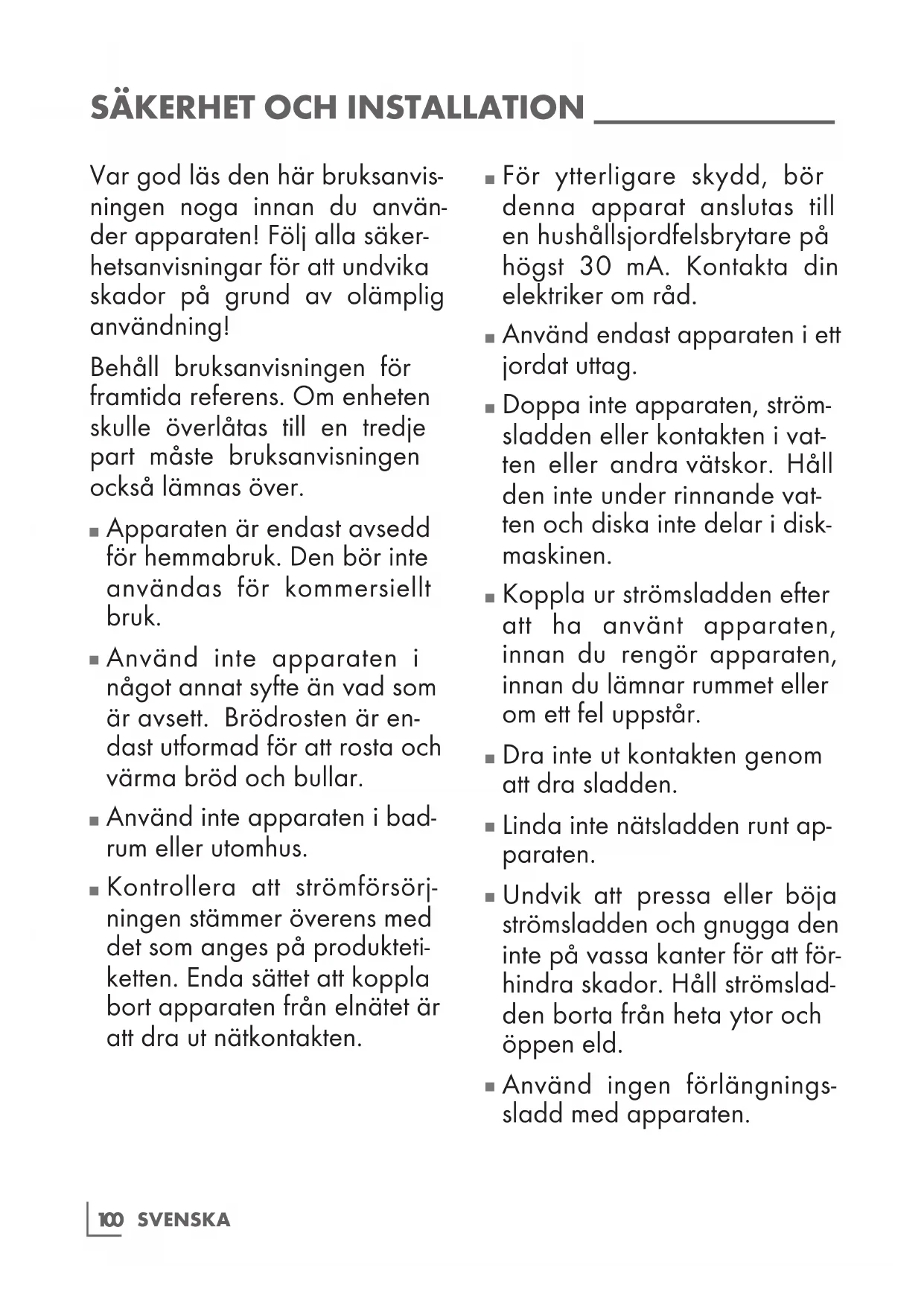 Använd inte apparaten i något annat syfte än vad som är avsett. Brödrosten är en- dast utformad för att rosta och värma bröd och bullar.