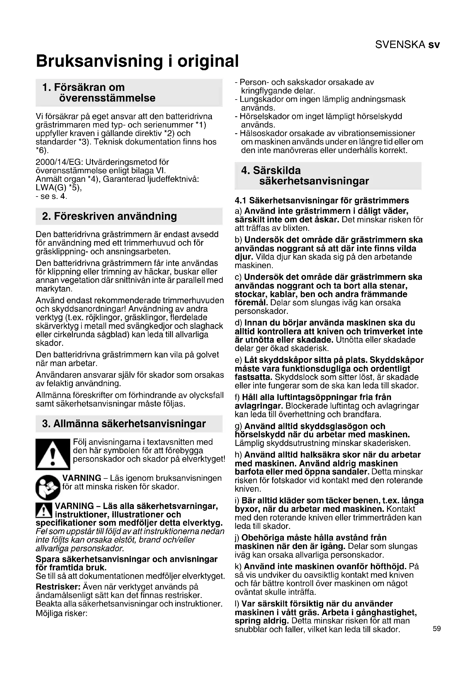 Bruksanvisning i original Vi försäkrar på eget ansvar att den batteridrivna grästrimmaren med typ- och serienummer *1) uppfyller kraven i gällande direktiv *2) och standarder *3). Teknisk dokumentation finns hos *6). 2000/14/EG: Utvärderingsmetod för överensstämmelse enligt bilaga VI. Anmält organ *4), Garanterad ljudeffektnivå: LWA(G) *5), - se s. 4. Den batteridrivna grästrimmern är endast avsedd för användning med ett trimmerhuvud och för gräsklippning- och ansningsarbeten. Den batteridrivna grästrimmern får inte användas för klippning eller trimning av häckar, buskar eller annan vegetation där snittnivån inte är parallell med markytan. Använd endast rekommenderade trimmerhuvuden och skyddsanordningar! Användning av andra verktyg (t.ex. röjklingor, gräsklingor, flerdelade skärverktyg i metall med svängkedjor och slaghack eller cirkelrunda sågblad) kan leda till allvarliga skador. Den batteridrivna grästrimmern kan vila på golvet när man arbetar. Användaren ansvarar själv för skador som orsakas av felaktig användning. Allmänna föreskrifter om förhindrande av olycksfall samt säkerhetsanvisningar måste följas. Följ anvisningarna i textavsnitten med den här symbolen för att förebygga personskador och skador på elverktyget! VARNING – Läs igenom bruksanvisningen för att minska risken för skador. VARNING – Läs alla säkerhetsvarningar, instruktioner, illustrationer och specifikationer som medföljer detta elverktyg. Fel som uppstår till följd av att instruktionerna nedan inte följts kan orsaka elstöt, brand och/eller allvarliga personskador. Spara säkerhetsanvisningar och anvisningar för framtida bruk. Se till så att dokumentationen medföljer elverktyget. Restrisker: Även när verktyget används på ändamålsenligt sätt kan det finnas restrisker. Beakta alla säkerhetsanvisningar och instruktioner. Möjliga risker: - Person- och sakskador orsakade av kringflygande delar. - Lungskador om ingen lämplig andningsmask används. - Hörselskador om inget lämpligt hörselskydd används. - Hälsoskador orsakade av vibrationsemissioner om maskinen används under en längre tid eller om den inte manövreras eller underhålls korrekt.