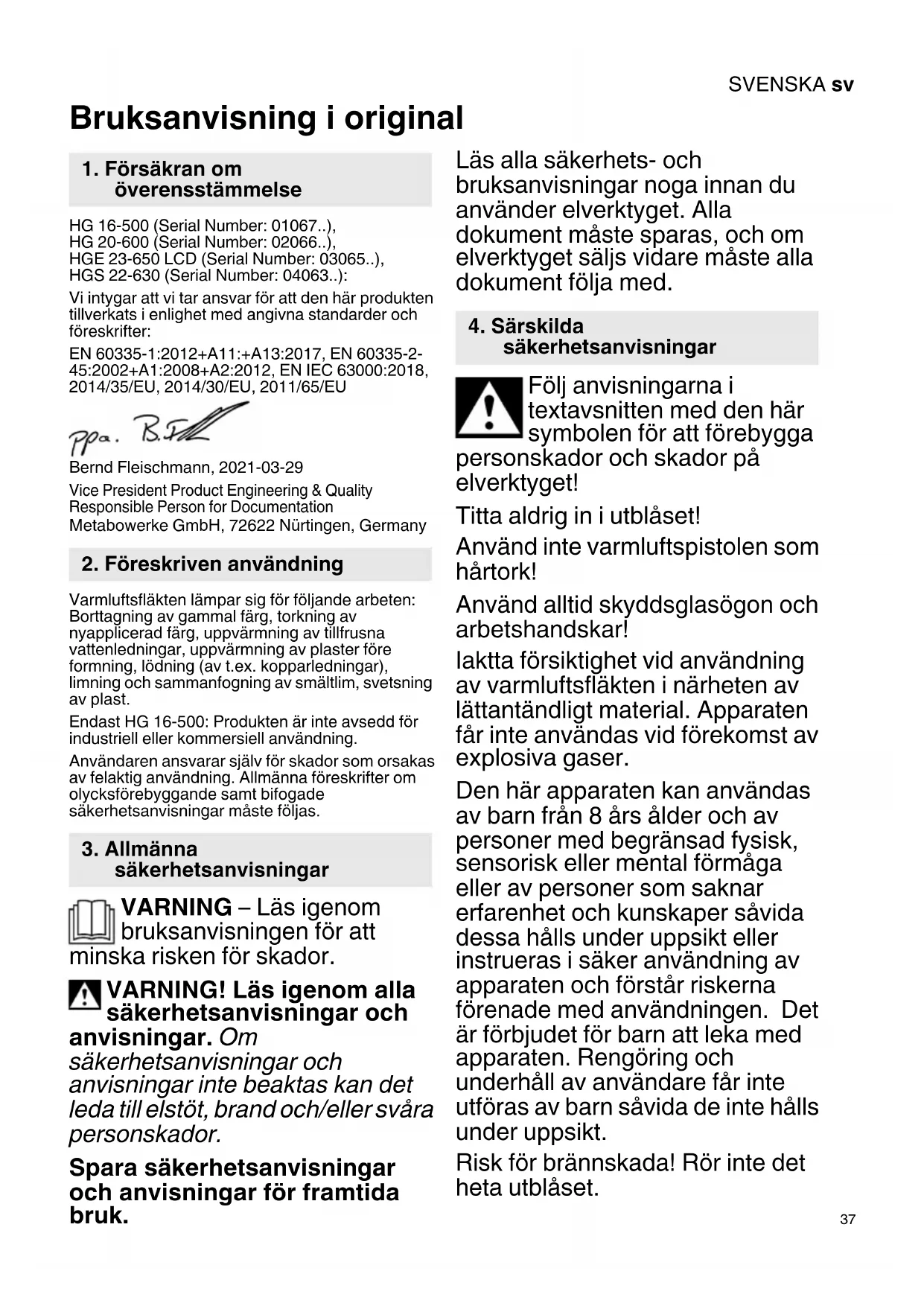 Bruksanvisning i original HG 16-500 (Serial Number: 01067..), HG 20-600 (Serial Number: 02066..), HGE 23-650 LCD (Serial Number: 03065..), HGS 22-630 (Serial Number: 04063..): Vi intygar att vi tar ansvar för att den här produkten tillverkats i enlighet med angivna standarder och föreskrifter: EN 60335-1:2012+A11:+A13:2017, EN 60335-2- 45:2002+A1:2008+A2:2012, EN IEC 63000:2018, 2014/35/EU, 2014/30/EU, 2011/65/EU Bernd Fleischmann, 2021-03-29 Vice President Product Engineering & Quality Responsible Person for Documentation Metabowerke GmbH, 72622 Nürtingen, Germany Varmluftsfläkten lämpar sig för följande arbeten: Borttagning av gammal färg, torkning av nyapplicerad färg, uppvärmning av tillfrusna vattenledningar, uppvärmning av plaster före formning, lödning (av t.ex. kopparledningar), limning och sammanfogning av smältlim, svetsning av plast. Endast HG 16-500: Produkten är inte avsedd för industriell eller kommersiell användning. Användaren ansvarar själv för skador som orsakas av felaktig användning. Allmänna föreskrifter om olycksförebyggande samt bifogade säkerhetsanvisningar måste följas. VARNING – Läs igenom bruksanvisningen för att minska risken för skador. VARNING! Läs igenom alla säkerhetsanvisningar och anvisningar. Om säkerhetsanvisningar och anvisningar inte beaktas kan det leda till elstöt, brand och/eller svåra personskador. Spara säkerhetsanvisningar och anvisningar för framtida bruk. Läs alla säkerhets- och bruksanvisningar noga innan du använder elverktyget. Alla dokument måste sparas, och om elverktyget säljs vidare måste alla dokument följa med. Följ anvisningarna i textavsnitten med den här symbolen för att förebygga personskador och skador på elverktyget! Titta aldrig in i utblåset! Använd inte varmluftspistolen som hårtork! Använd alltid skyddsglasögon och arbetshandskar! Iaktta försiktighet vid användning av varmluftsfläkten i närheten av lättantändligt material. Apparaten får inte användas vid förekomst av explosiva gaser. Den här apparaten kan användas av barn från 8 års ålder och av personer med begränsad fysisk, sensorisk eller mental förmåga eller av personer som saknar erfarenhet och kunskaper såvida dessa hålls under uppsikt eller instrueras i säker användning av apparaten och förstår riskerna förenade med användningen. Det är förbjudet för barn att leka med apparaten. Rengöring och underhåll av användare får inte utföras av barn såvida de inte hålls under uppsikt. Risk för brännskada! Rör inte det heta utblåset.